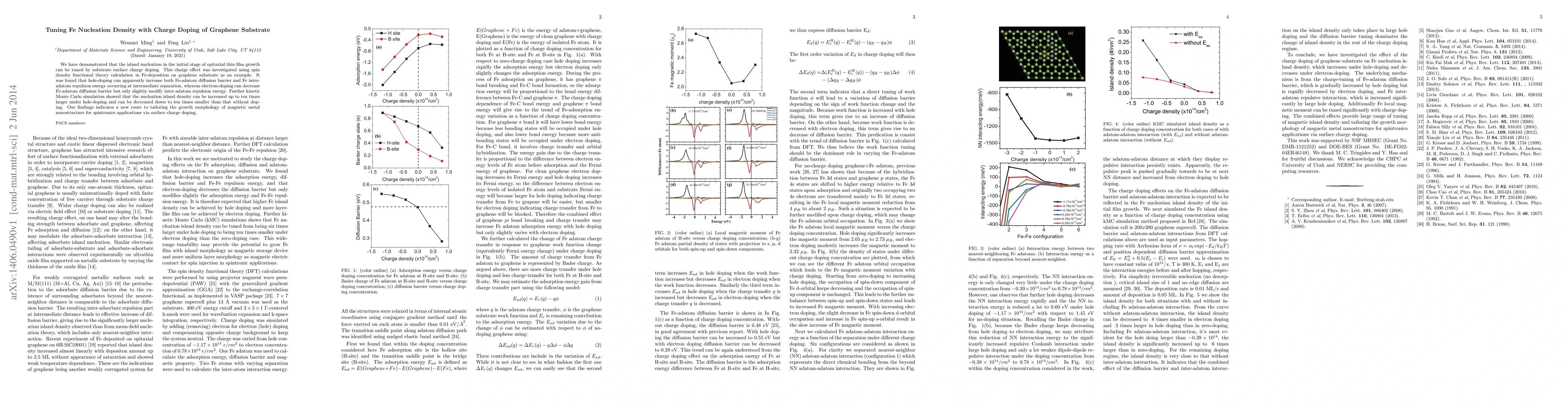 We have demonstrated that the island nucleation in the initial stage of epitaxial thin film growth can be tuned by substrate surface charge doping. This charge effect was investigated using spin density functional theory calculation in Fe-deposition on graphene substrate as an example. It was found that hole-doping can apparently increase both Fe-adatom diffusion barrier and Fe inter-adatom repulsion energy occurring at intermediate separation, whereas electron-doping can decrease Fe-adatom diffusion barrier but only slightly modify inter-adatom repulsion energy. Further kinetic Monte Carlo simulation showed that the nucleation island density can be increased up to ten times larger under hole-doping and can be decreased down to ten times smaller than that without doping. Our findings indicates a new route to tailoring the growth morphology of magnetic metal nanostructure for spintronics applications via surface charge doping.