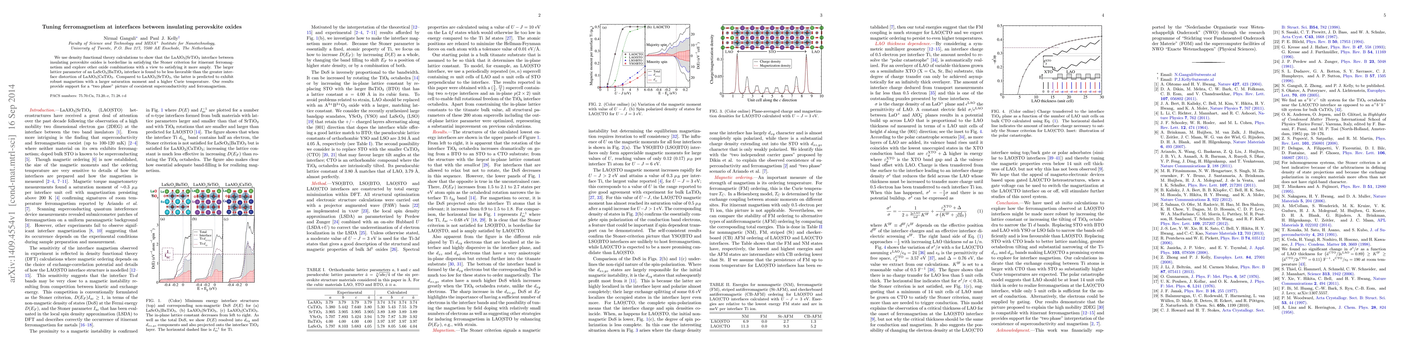 We use density functional theory calculations to show that the LaAlO3|SrTiO3 interface between insulating perovskite oxides is borderline in satisfying the Stoner criterion for itinerant ferromagnetism and explore other oxide combinations with a view to satisfying it more amply. The larger lattice parameter of an LaScO3|BaTiO3 interface is found to be less favorable than the greater interface distortion of LaAlO3|CaTiO3. Compared to LaAlO3|SrTiO3, the latter is predicted to exhibit robust magnetism with a larger saturation moment and a higher Curie temperature. Our results provide support for a "two phase" picture of coexistent superconductivity and ferromagnetism.