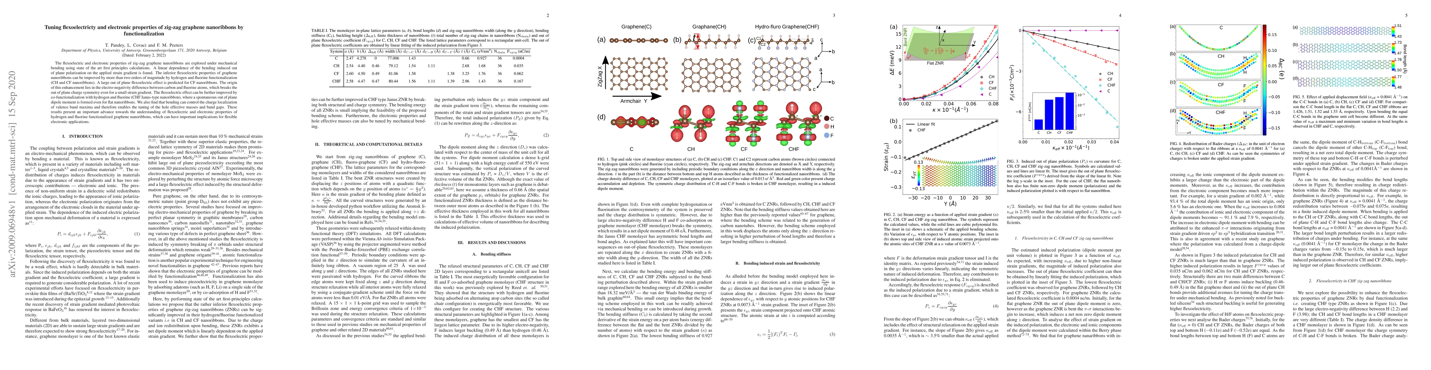 The flexoelectric and electronic properties of zig-zag graphene nanoribbons are explored under mechanical bending using state of the art first principles calculations. A linear dependence of the bending induced out of plane polarization on the applied strain gradient is found. The inferior flexoelectric properties of graphene nanoribbons can be improved by more than two orders of magnitude by hydrogen and fluorine functionalization (CH and CF nanoribbons). A large out of plane flexoelectric effect is predicted for CF nanoribbons. The origin of this enhancement lies in the electro-negativity difference between carbon and fluorine atoms, which breaks the out of plane charge symmetry even for a small strain gradient. The flexoelectric effect can be further improved by co-functionalization with hydrogen and fluorine (CHF Janus-type nanoribbon), where a spontaneous out of plane dipole moment is formed even for flat nanoribbons. We also find that bending can control the charge localization of valence band maxima and therefore enables the tuning of the hole effective masses and band gaps. These results present an important advance towards the understanding of flexoelectric and electronic properties of hydrogen and fluorine functionalized graphene nanoribbons, which can have important implications for flexible electronic applications.