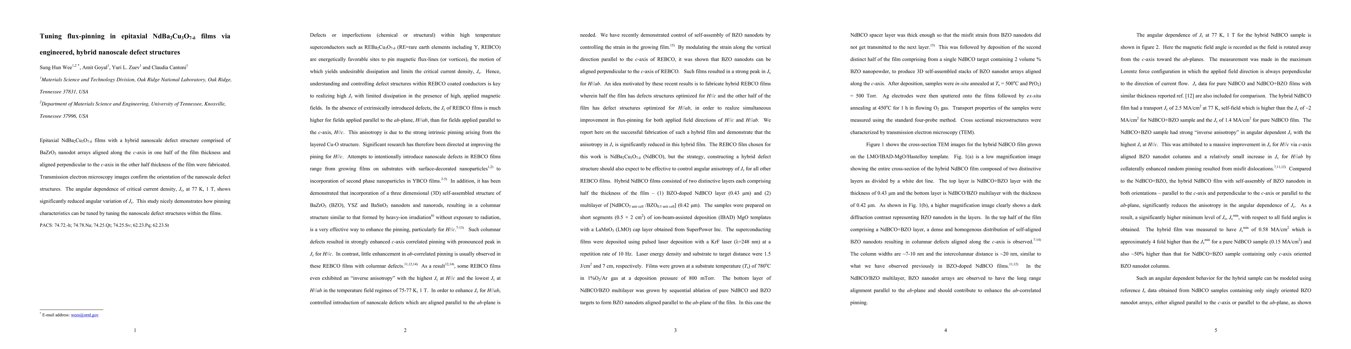 Epitaxial NdBa2Cu3O7-x films with a hybrid nanoscale defect structure comprised of BaZrO3 nanodot arrays aligned along the c-axis in one half of the film thickness and aligned perpendicular to the c-axis in the other half thickness of the film were fabricated. Transmission electron microscopy images confirm the orientation of the nanoscale defect structures. The angular dependence of critical current density, Jc, at 77 K, 1 T, shows significantly reduced angular variation of Jc. This study nicely demonstrates how pinning characteristics can be tuned by tuning the nanoscale defect structures within the films.