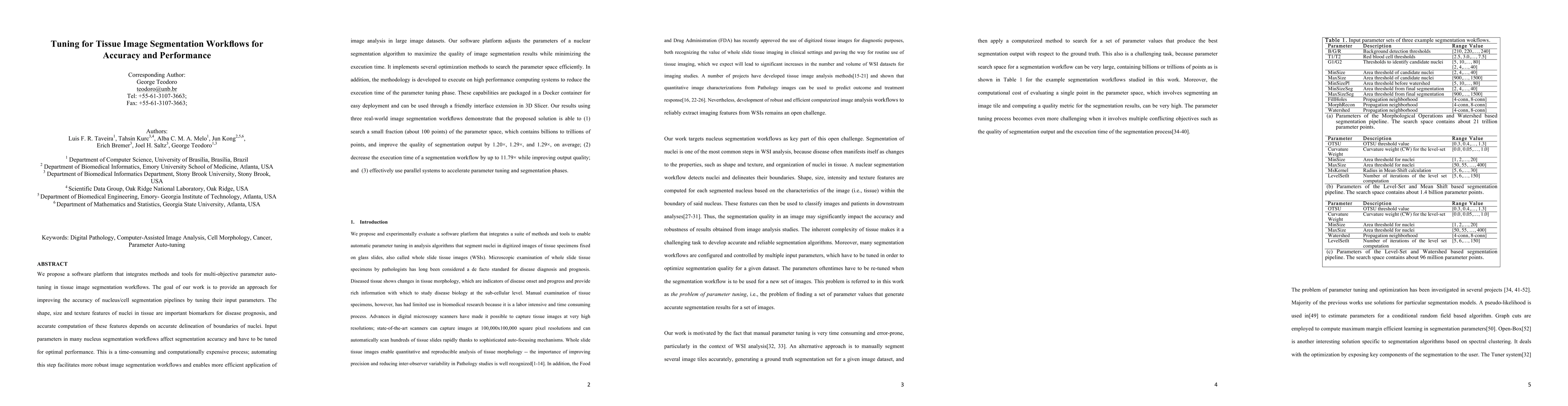 We propose a software platform that integrates methods and tools for multi-objective parameter auto- tuning in tissue image segmentation workflows. The goal of our work is to provide an approach for improving the accuracy of nucleus/cell segmentation pipelines by tuning their input parameters. The shape, size and texture features of nuclei in tissue are important biomarkers for disease prognosis, and accurate computation of these features depends on accurate delineation of boundaries of nuclei. Input parameters in many nucleus segmentation workflows affect segmentation accuracy and have to be tuned for optimal performance. This is a time-consuming and computationally expensive process; automating this step facilitates more robust image segmentation workflows and enables more efficient application of image analysis in large image datasets. Our software platform adjusts the parameters of a nuclear segmentation algorithm to maximize the quality of image segmentation results while minimizing the execution time. It implements several optimization methods to search the parameter space efficiently. In addition, the methodology is developed to execute on high performance computing systems to reduce the execution time of the parameter tuning phase. Our results using three real-world image segmentation workflows demonstrate that the proposed solution is able to (1) search a small fraction (about 100 points) of the parameter space, which contains billions to trillions of points, and improve the quality of segmentation output by 1.20x, 1.29x, and 1.29x, on average; (2) decrease the execution time of a segmentation workflow by up to 11.79x while improving output quality; and (3) effectively use parallel systems to accelerate parameter tuning and segmentation phases.
