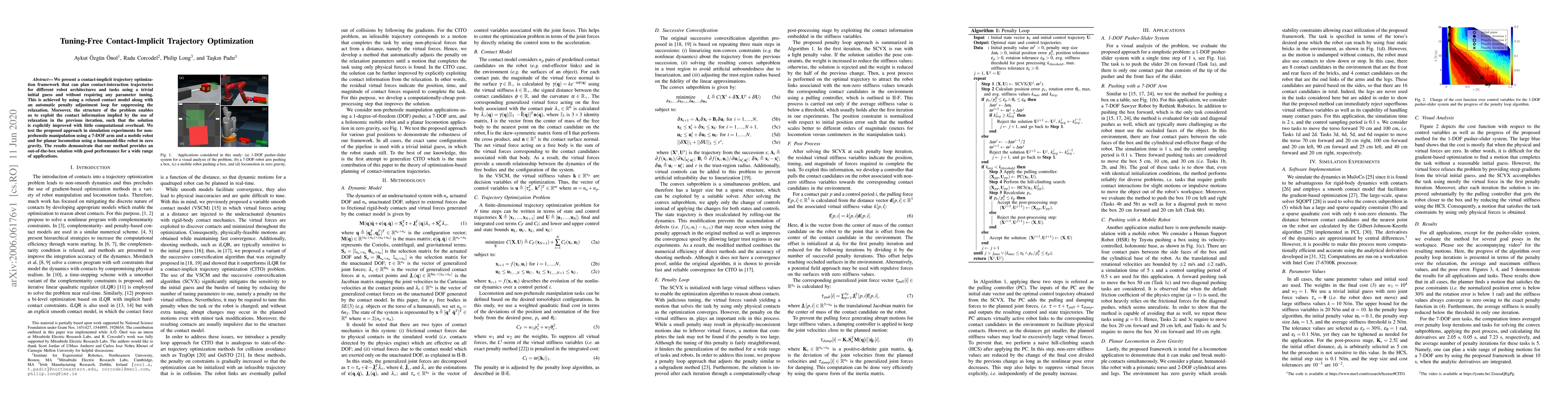 We present a contact-implicit trajectory optimization framework that can plan contact-interaction trajectories for different robot architectures and tasks using a trivial initial guess and without requiring any parameter tuning. This is achieved by using a relaxed contact model along with an automatic penalty adjustment loop for suppressing the relaxation. Moreover, the structure of the problem enables us to exploit the contact information implied by the use of relaxation in the previous iteration, such that the solution is explicitly improved with little computational overhead. We test the proposed approach in simulation experiments for non-prehensile manipulation using a 7-DOF arm and a mobile robot and for planar locomotion using a humanoid-like robot in zero gravity. The results demonstrate that our method provides an out-of-the-box solution with good performance for a wide range of applications.