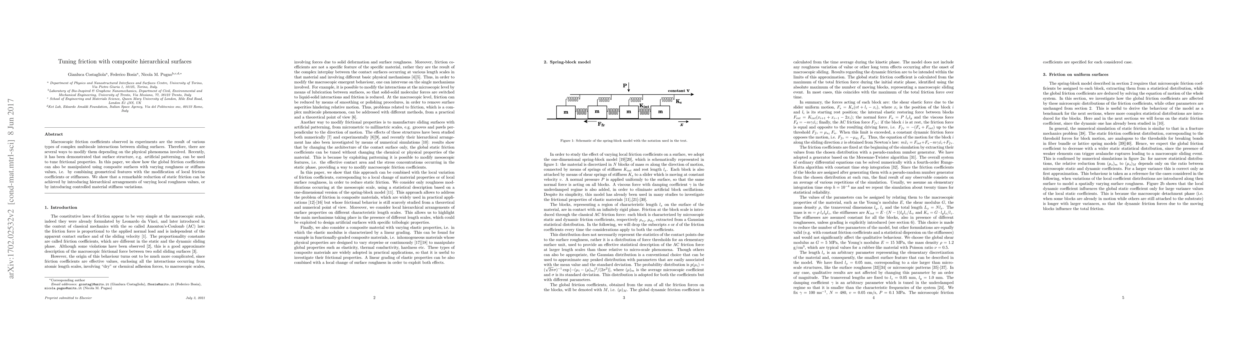 Macroscopic friction coefficients observed in experiments are the result of various types of complex multiscale interactions between sliding surfaces. Therefore, there are several ways to modify them depending on the physical phenomena involved. Recently, it has been demonstrated that surface structure, e.g. artificial patterning, can be used to tune frictional properties. In this paper, we show how the global friction coefficients can also be manipulated using composite surfaces with varying roughness or stiffness values, i.e. by combining geometrical features with the modification of local friction coefficients or stiffnesses. We show that a remarkable reduction of static friction can be achieved by introducing hierarchical arrangements of varying local roughness values, or by introducing controlled material stiffness variations.