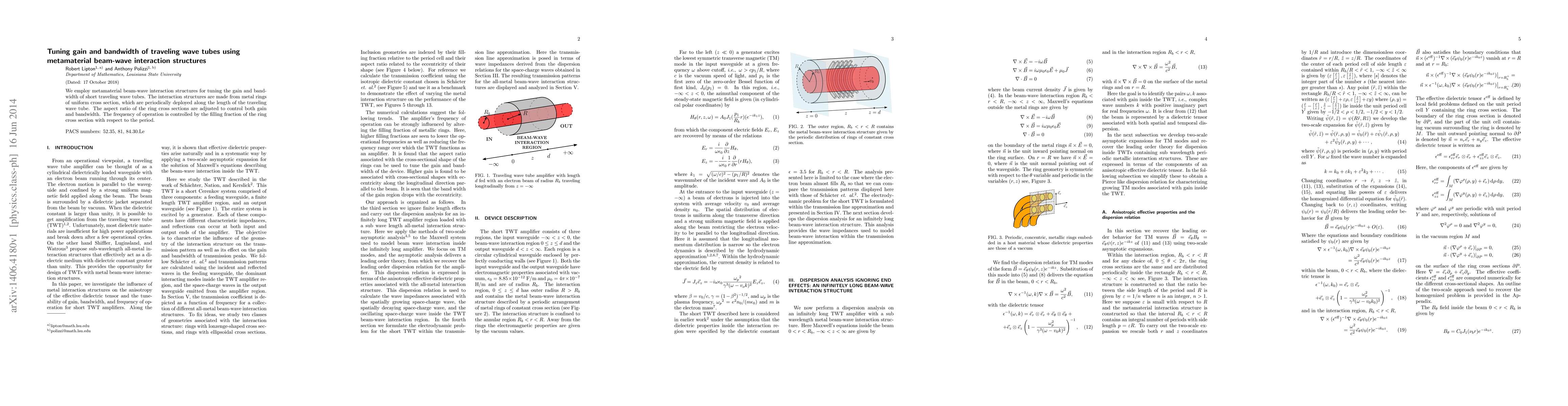 We employ metamaterial beam-wave interaction structures for tuning the gain and bandwidth of short traveling wave tubes. The interaction structures are made from metal rings of uniform cross section, which are periodically deployed along the length of the traveling wave tube. The aspect ratio of the ring cross sections are adjusted to control both gain and bandwidth. The frequency of operation is controlled by the filling fraction of the ring cross section with respect to the period.