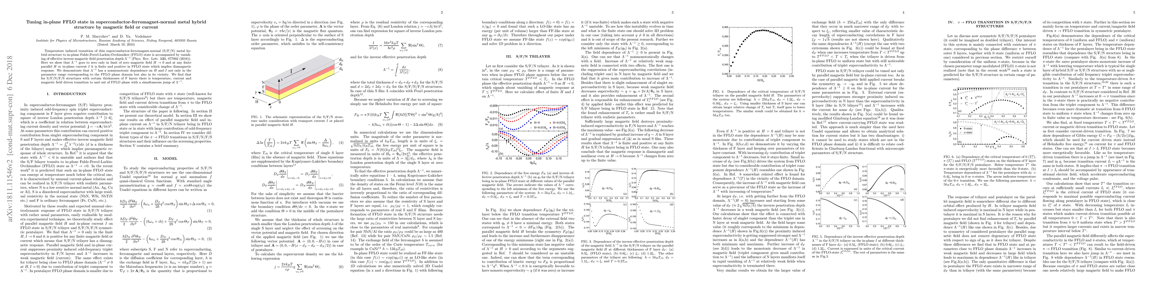 This paper investigates the in-plane FFLO state in superconductor-ferromagnet-normal metal hybrid structures, demonstrating that the effective inverse magnetic field penetration depth $\Lambda^{-1}$ is finite and positive under finite magnetic fields or currents, indicating a diamagnetic response. It also shows a nonmonotonic dependence of $\Lambda^{-1}$ on magnetic fields and currents, revealing a temperature, current, and magnetic field-driven transition to and out of the FFLO phase.