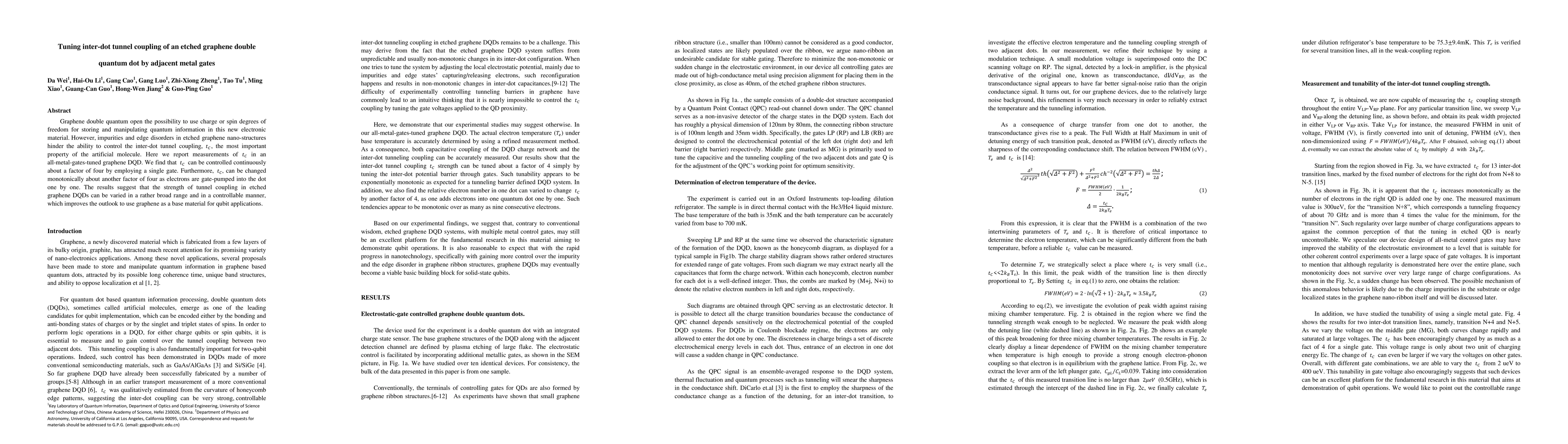 Graphene double quantum open the possibility to use charge or spin degrees of freedom for storing and manipulating quantum information in this new electronic material. However, impurities and edge disorders in etched graphene nano-structures hinder the ability to control the inter-dot tunnel coupling, tc,the most important property of the artificial molecule. Here we report measurements of tc in an all-metal-gates-tuned graphene DQD. We find that tc can be controlled continuously about a factor of four by employing a single gate. Furthermore, tc, can be changed monotonically about another factor of four as electrons are gate-pumped into the dot one by one. The results suggest that the strength of tunnel coupling in etched DQDs can be varied in a rather broad range and in a controllable manner, which improves the outlook to use graphene as a base material for qubit applications.