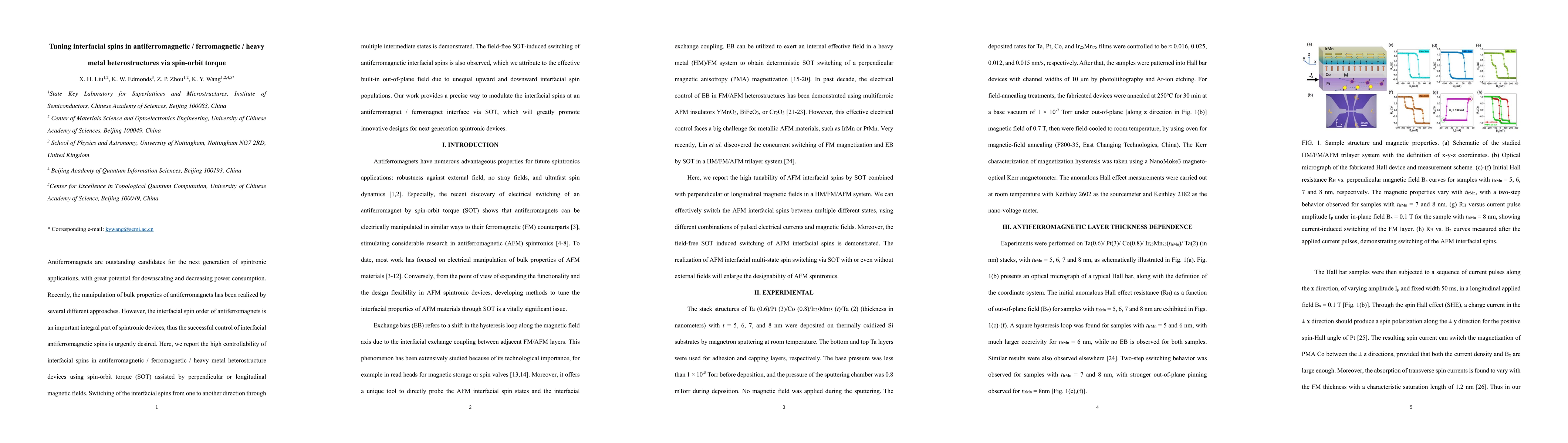Antiferromagnets are outstanding candidates for the next generation of spintronic applications, with great potential for downscaling and decreasing power consumption. Recently, the manipulation of bulk properties of antiferromagnets has been realized by several different approaches. However, the interfacial spin order of antiferromagnets is an important integral part of spintronic devices, thus the successful control of interfacial antiferromagnetic spins is urgently desired. Here, we report the high controllability of interfacial spins in antiferromagnetic / ferromagnetic / heavy metal heterostructure devices using spin-orbit torque (SOT) assisted by perpendicular or longitudinal magnetic fields. Switching of the interfacial spins from one to another direction through multiple intermediate states is demonstrated. The field-free SOT-induced switching of antiferromagnetic interfacial spins is also observed, which we attribute to the effective built-in out-of-plane field due to unequal upward and downward interfacial spin populations. Our work provides a precise way to modulate the interfacial spins at an antiferromagnet / ferromagnet interface via SOT, which will greatly promote innovative designs for next generation spintronic devices.