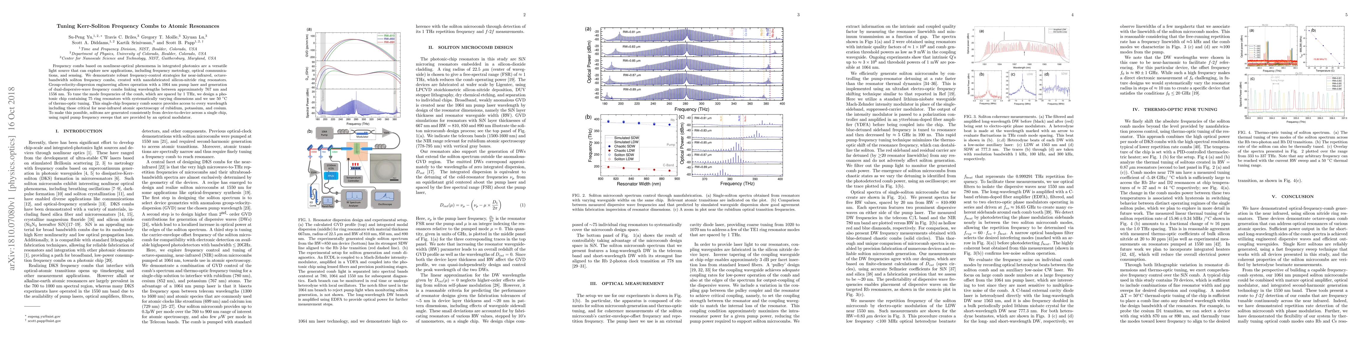 This research demonstrates the precise tuning of octave-bandwidth soliton frequency combs in silicon-nitride ring resonators for applications in atomic spectroscopy, employing group-velocity-dispersion engineering and thermo-optic tuning to align comb mode frequencies with atomic resonances of rubidium, potassium, and cesium. The use of pump frequency sweeps ensures consistent soliton generation across a photonic chip with multiple ring resonators.