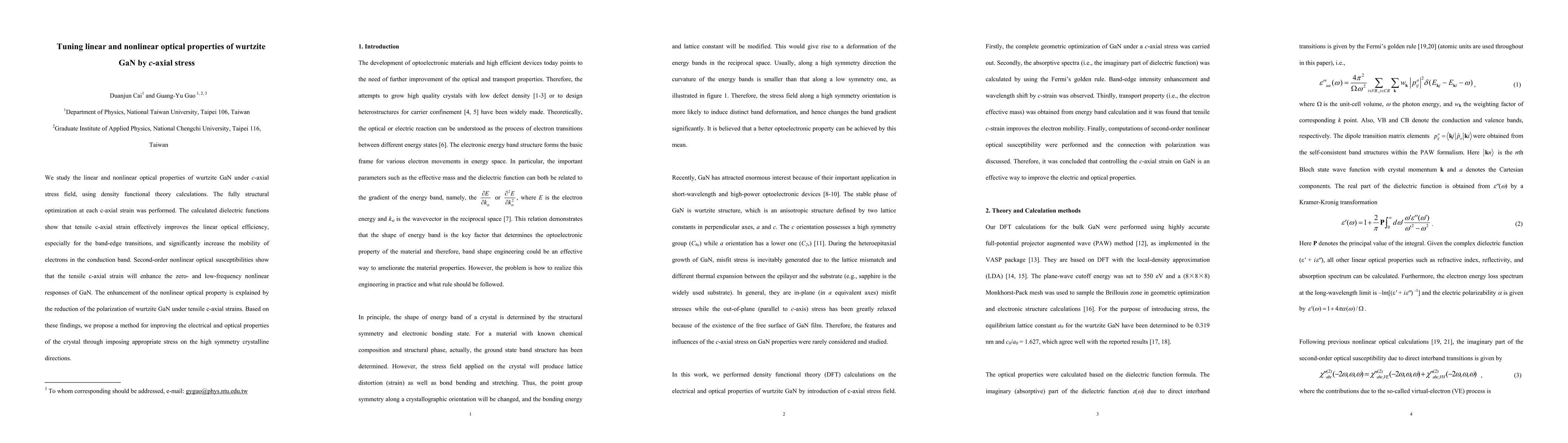 We study the linear and nonlinear optical properties of wurtzite GaN under c-axial stress field, using density functional theory calculations. The fully structural optimization at each c-axial strain was performed. The calculated dielectric functions show that tensile c-axial strain effectively improves the linear optical efficiency, especially for the band-edge transitions, and significantly increase the mobility of electrons in the conduction band. Second-order nonlinear optical susceptibilities show that the tensile c-axial strain will enhance the zero- and low-frequency nonlinear responses of GaN. The enhancement of the nonlinear optical property is explained by the reduction of the polarization of wurtzite GaN under tensile c-axial strains. Based on these findings, we propose a method for improving the electrical and optical properties of the crystal through imposing appropriate stress on the high symmetry crystalline directions.