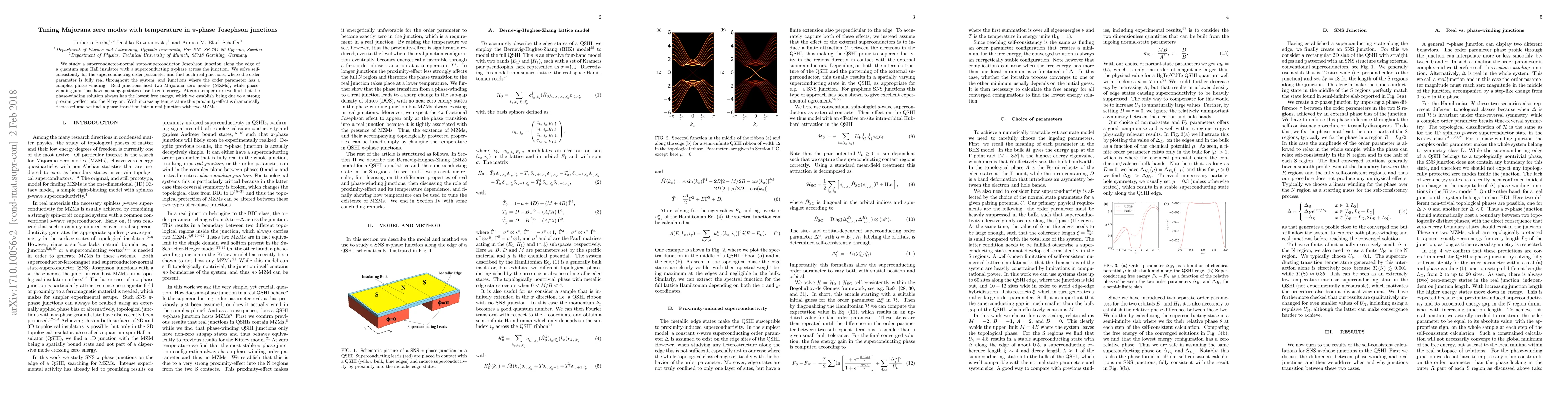 We study a superconductor-normal state-superconductor (SNS) Josephson junction along the edge of a quantum spin Hall insulator (QSHI) with a superconducting $\pi$-phase across the junction. We solve self-consistently for the superconducting order parameter and find both real junctions, where the order parameter is fully real throughout the system, and junctions where the order parameter has a complex phase winding. Real junctions host two Majorana zero modes (MZMs), while phase-winding junctions have no subgap states close to zero energy. At zero temperature we find that the phase-winding solution always has the lowest free energy, which we establish being due to a strong proximity-effect into the N region. With increasing temperature this proximity-effect is dramatically decreased and we find a phase transition into a real junction with two MZMs.