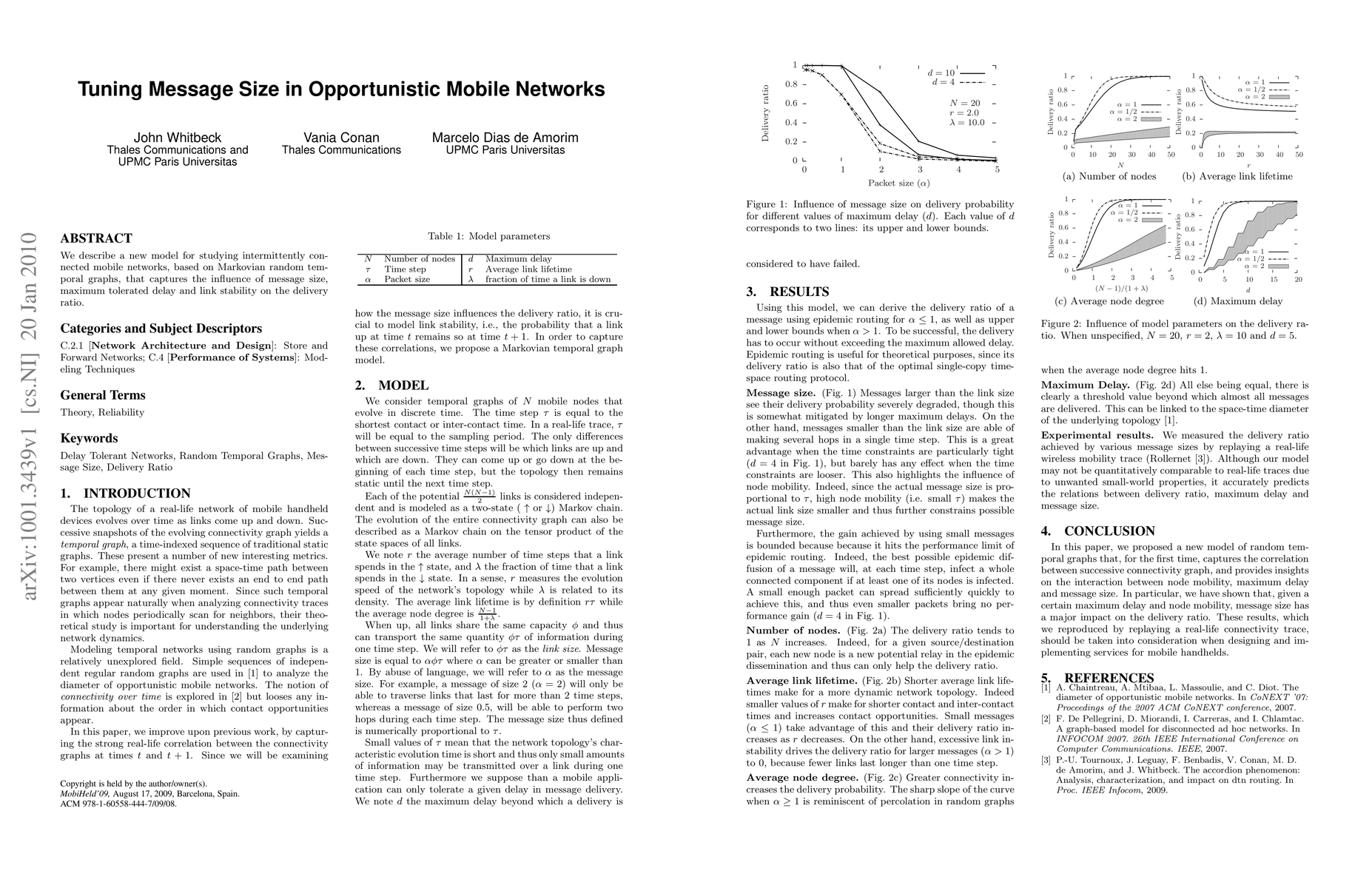 This paper introduces a Markovian random temporal graph model to study intermittently connected mobile networks, focusing on how message size, delay tolerance, and link stability affect message delivery ratio. The model aims to optimize message size for efficient communication in such networks.