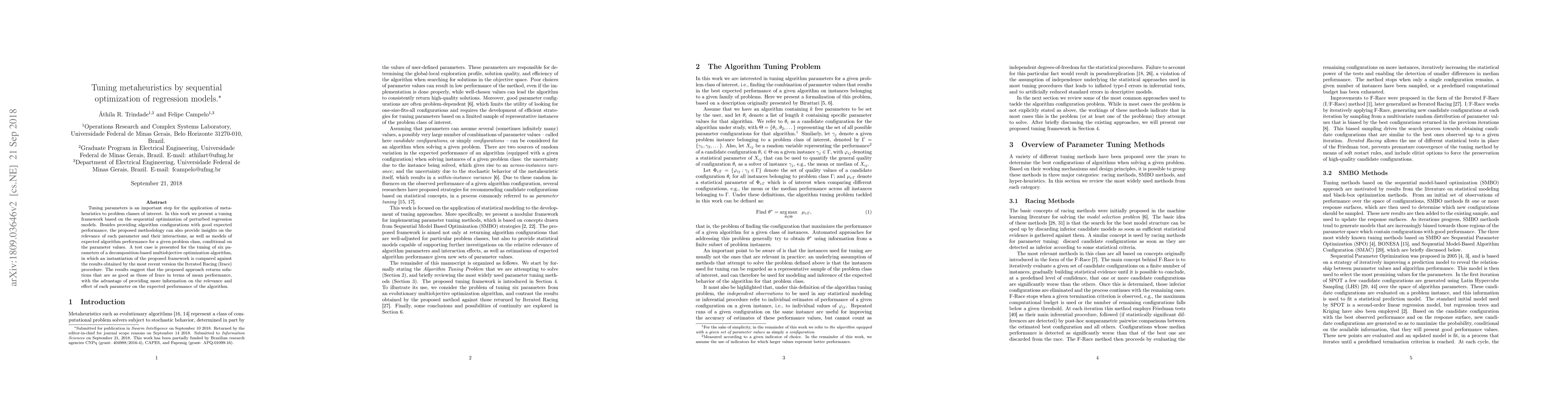This paper proposes a tuning framework for metaheuristics using sequential optimization of perturbed regression models, which provides good algorithm configurations and insights into parameter relevance and interactions. The method is tested for tuning six parameters of a multiobjective optimization algorithm, showing comparable performance to Irace but with additional parameter effect information.