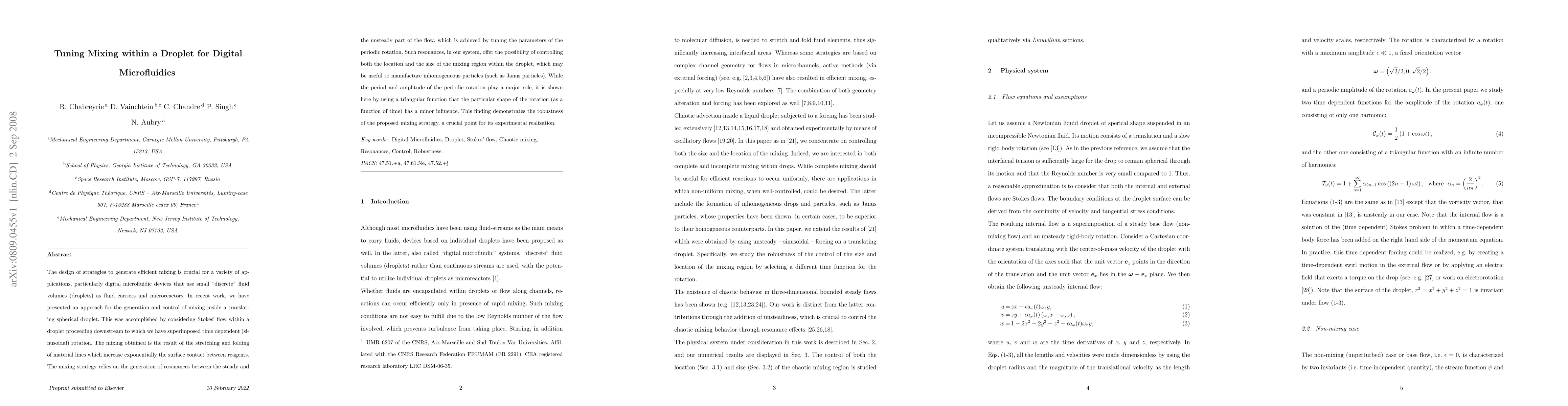 This paper presents a method for efficient mixing within a translating droplet in digital microfluidics by superimposing time-dependent rotation on Stokes' flow. The mixing strategy leverages resonances between steady and unsteady flow components, allowing control over the mixing region's size and location, which is vital for creating inhomogeneous particles like Janus particles.