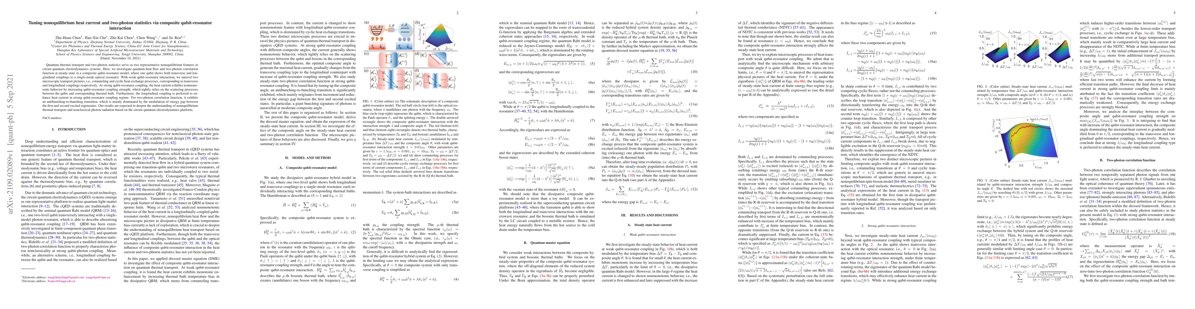 This research explores a composite qubit-resonator model, revealing two microscopic heat transport processes and two-photon correlation function changes at steady-state. The study identifies cotunneling and cyclic heat exchange for weak coupling, and nonmonotonic heat current behavior with strong coupling, favoring longitudinal coupling. The two-photon correlation function shows antibunching-to-bunching transition, influenced by energy gap modulation. The findings enhance understanding of nonequilibrium thermal transport and nonclassical photon radiation in circuit quantum electrodynamics.