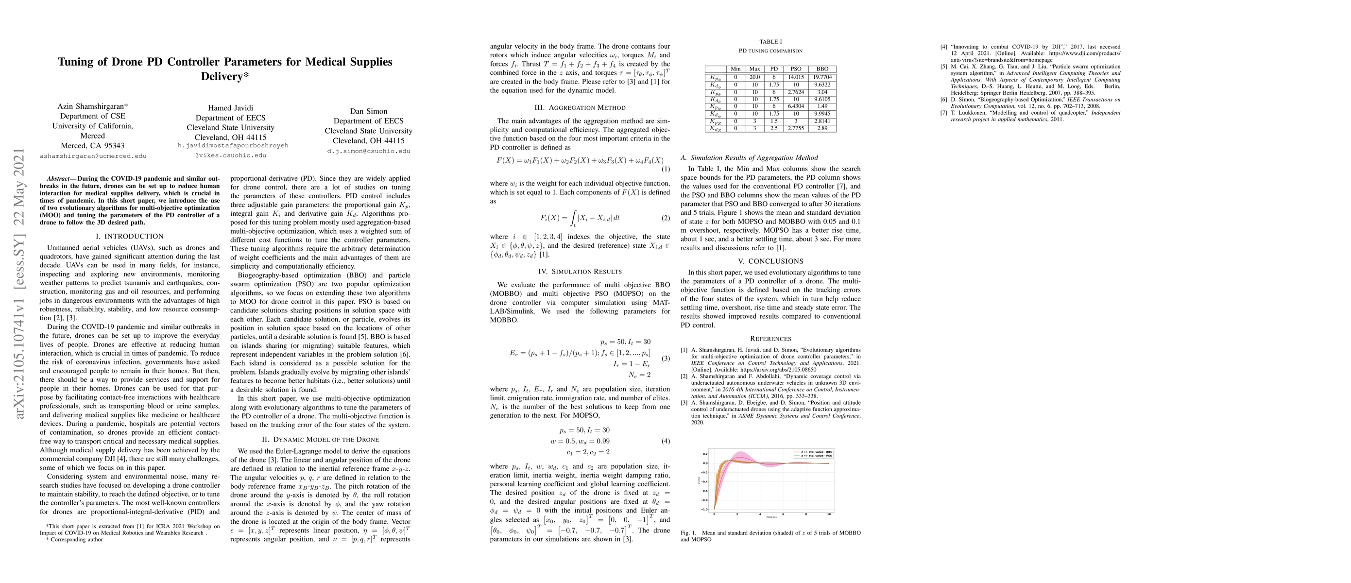 During the COVID-19 pandemic and similar outbreaks in the future, drones can be set up to reduce human interaction for medical supplies delivery, which is crucial in times of pandemic. In this short paper, we introduce the use of two evolutionary algorithms for multi-objective optimization (MOO) and tuning the parameters of the PD controller of a drone to follow the 3D desired path.