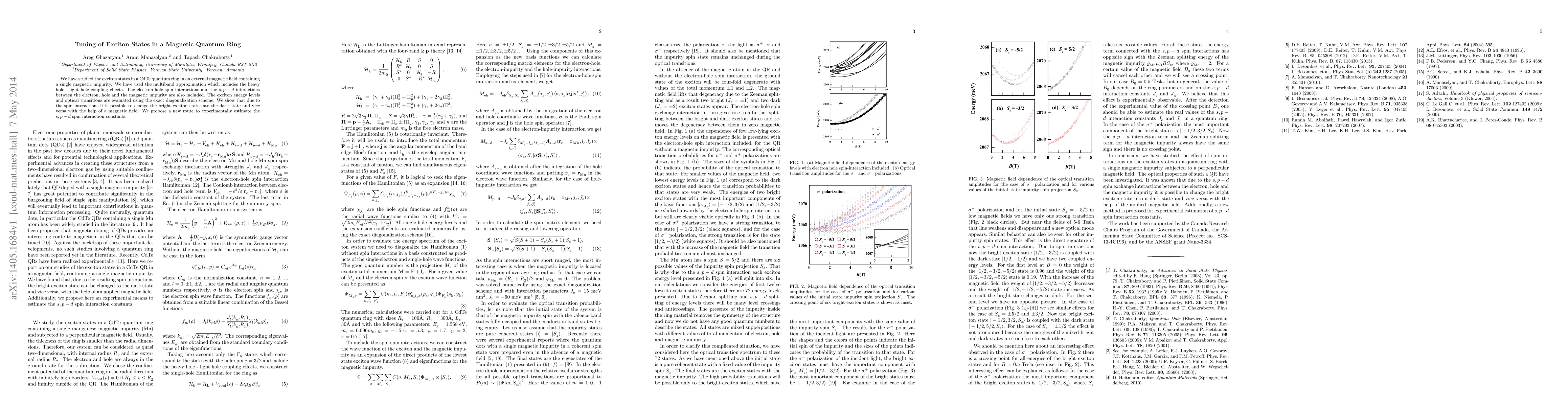 We have studied the exciton states in a CdTe quantum ring in an external magnetic field containing a single magnetic impurity. We have used the multiband approximation which includes the heavy hole - light hole coupling effects. The electron-hole spin interactions and the s, p-d interactions between the electron, hole and the magnetic impurity are also included. The exciton energy levels and optical transitions are evaluated using the exact diagonalization scheme. We show that due to the spin interactions it is possible to change the bright exciton state into the dark state and vice versa with the help of a magnetic field. We propose a new route to experimentally estimate the s, p-d spin interaction constants.