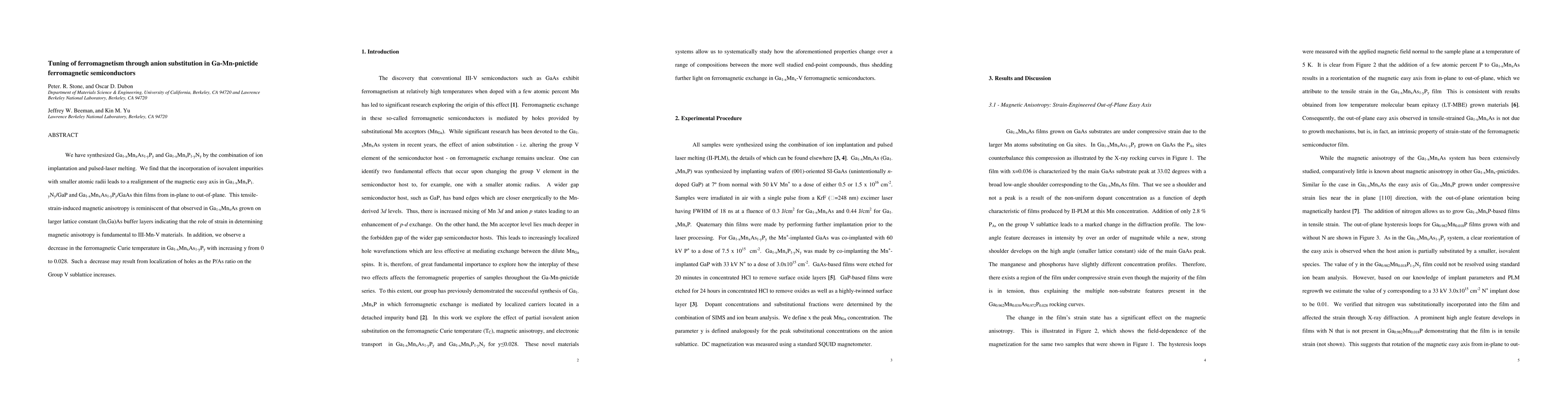 We have synthesized Ga1-xMnxAs1-yPy and Ga1-xMnxP1-yNy by the combination of ion implantation and pulsed-laser melting. We find that the incorporation of isovalent impurities with smaller atomic radii leads to a realignment of the magnetic easy axis in Ga1-xMnxP1-yNy/GaP and Ga1-xMnxAs1-yPy/GaAs thin films from in-plane to out-of-plane. This tensile-strain-induced magnetic anisotropy is reminiscent of that observed in Ga1-xMnxAs grown on larger lattice constant (In,Ga)As buffer layers indicating that the role of strain in determining magnetic anisotropy is fundamental to III-Mn-V materials. In addition, we observe a decrease in the ferromagnetic Curie temperature in Ga1-xMnxAs1-yPy with increasing y from 0 to 0.028. Such a decrease may result from localization of holes as the P/As ratio on the Group V sublattice increases.