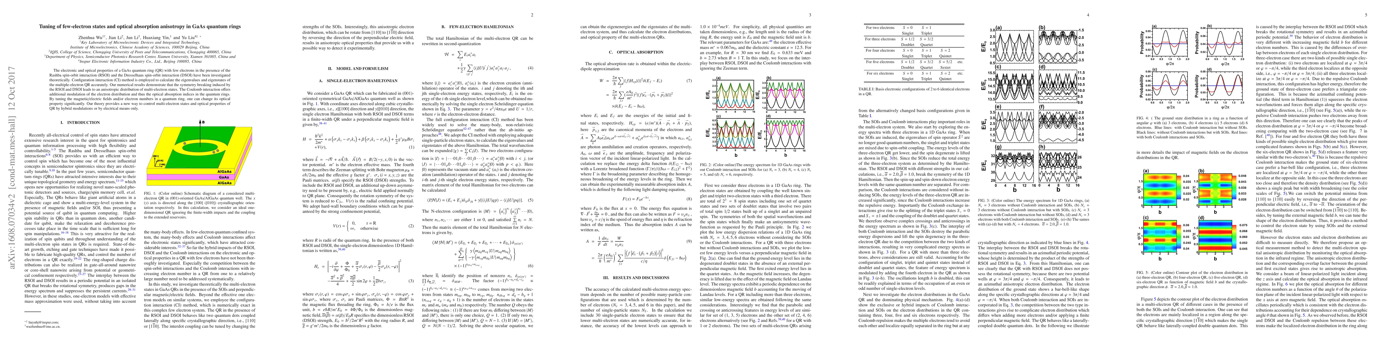 The electronic and optical properties of a GaAs quantum ring (QR) with few electrons in the presence of the Rashba spin-orbit interaction (RSOI) and the Dresselhaus spin-orbit interaction (DSOI) have been investigated theoretically. Configuration interaction (CI) method is employed to calculate the eigenvalues and eigenstates of the multiple-electron QR accurately. Our numerical results demonstrate that the symmetry breaking induced by the RSOI and DSOI leads to an anisotropic distribution of multi-electron states. The Coulomb interaction offers additional modulation of the electron distribution and thus the optical absorption indices in the quantum rings. By tuning the magnetic/electric fields and/or electron numbers in a quantum ring, one can change its optical property significantly. Our theory provides a new way to control multi-electron states and optical properties of QR by hybrid modulations or by electrical means only.