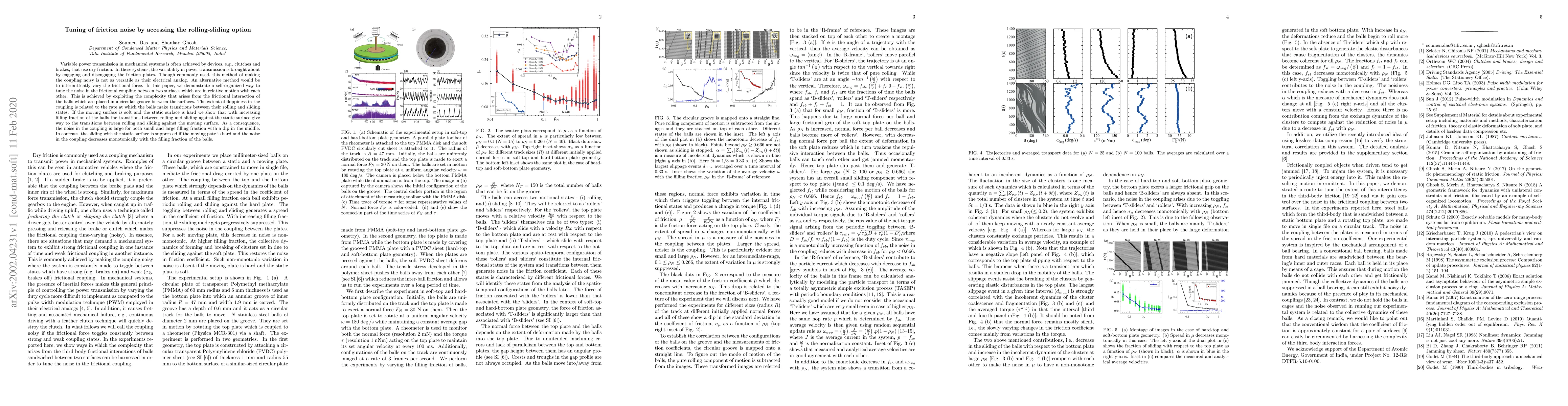 This paper explores a method to tune friction noise in mechanical systems by manipulating the rolling-sliding transitions of balls in a circular groove between moving and static surfaces. The noise is highest at low and high ball filling fractions, with a dip in between, due to transitions between rolling and sliding states against the surfaces.