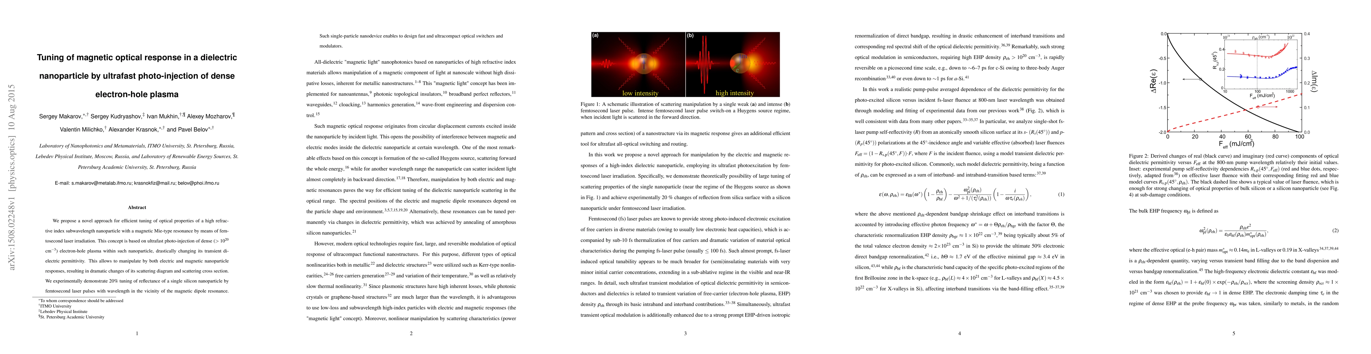 This paper proposes a method to tune the optical properties of a dielectric nanoparticle with magnetic resonance using femtosecond laser pulses to inject dense electron-hole plasma, significantly altering its dielectric permittivity and scattering characteristics. Experimental results show a 20% tuning of reflectance in a silicon nanoparticle, enabling the design of fast, compact optical switches and modulators.