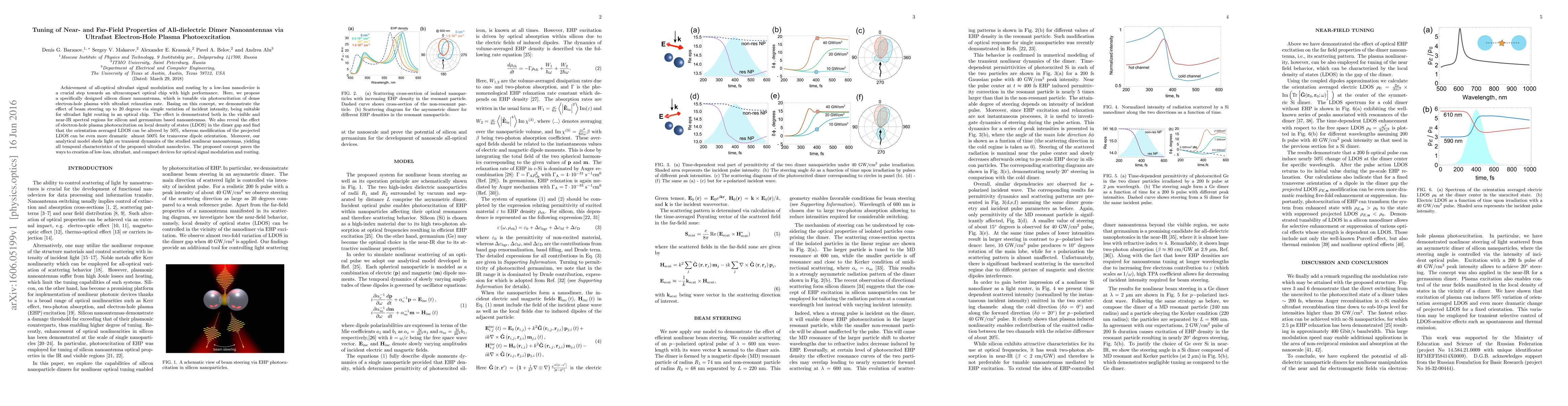 This paper proposes a silicon dimer nanoantenna that can be tuned via ultrafast electron-hole plasma photoexcitation, demonstrating beam steering up to 20 degrees and significant modulation of local density of states, paving the way for ultracompact, high-performance optical chips. The study also provides an analytical model for the transient dynamics and nonlinear behavior of the nanoantenna.