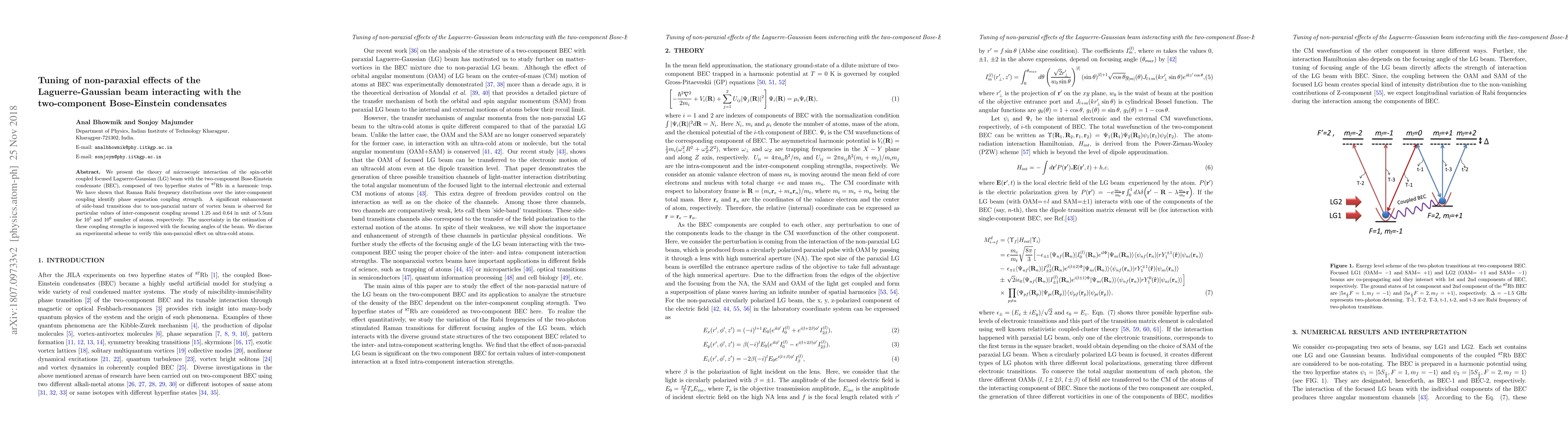 This paper develops a theoretical framework for the interaction between a focused Laguerre-Gaussian beam and a two-component Bose-Einstein condensate, revealing enhanced side-band transitions due to the beam's non-paraxial nature, and proposes an experimental setup to verify these effects.