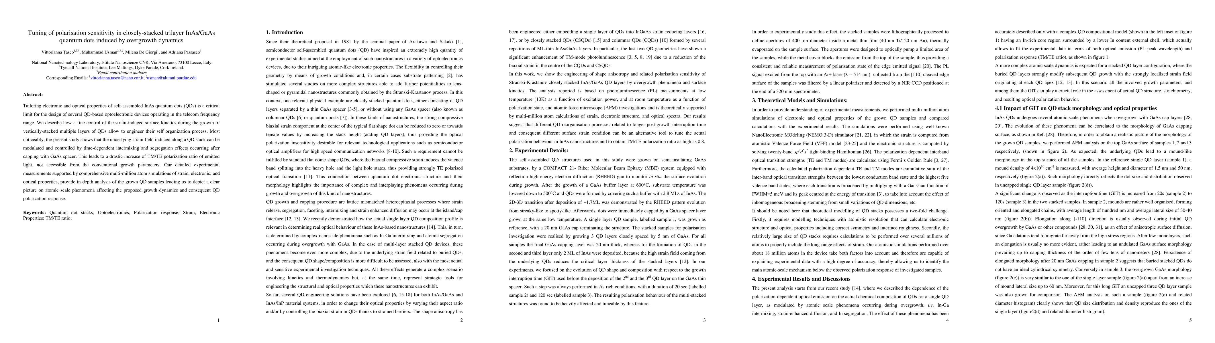 Tailoring electronic and optical properties of self-assembled InAs quantum dots (QDs) is a critical limit for the design of several QD-based optoelectronic devices operating in the telecom frequency range. We describe how a fine control of the strain-induced surface kinetics during the growth of vertically-stacked multiple layers of QDs allow to engineer their self organization process. Most noticeably, the present study shows that the underlying strain field induced along a QD stack can be modulated and controlled by time-dependent intermixing and segregation effects occurring after capping with GaAs spacer. This leads to a drastic increase of TM/TE polarization ratio of emitted light, not accessible from the conventional growth parameters. Our detailed experimental measurements supported by comprehensive multi-million atom simulations of strain, electronic, and optical properties, provide in-depth analysis of the grown QD samples leading us to depict a clear picture on atomic scale phenomena affecting the proposed growth dynamics and consequent QD polarization response.