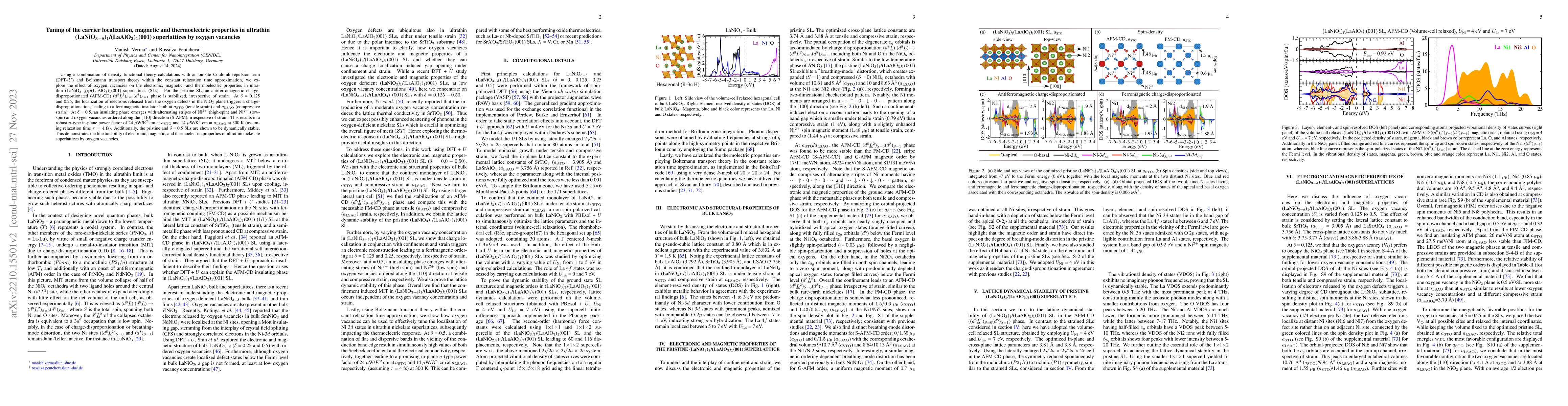 Using a combination of density functional theory calculations with an on-site Coulomb repulsion term (DFT+$U$) and Boltzmann transport theory within the constant relaxation time approximation, we explore the effect of oxygen vacancies on the electronic, magnetic, and thermoelectric properties in ultrathin (LaNiO$_{3-\delta}$)$_1$/(LaAlO$_{3}$)$_1$(001) superlattices (SLs). For the pristine SL, an antiferromagnetic charge-disproportionated (AFM-CD) ($d^{8}${$\underline L$}$^{2}$)$_{S=0}$($d^{8}$)$_{S=1}$ phase is stabilized, irrespective of strain. At $\delta$ = 0.125 and 0.25, the localization of electrons released from the oxygen defects in the NiO$_{2}$ plane triggers a charge-disproportionation, leading to a ferrimagnetic insulator both at $a_{\mathrm{STO}}$ (tensile strain) and $a_{\mathrm{LSAO}}$ (compressive strain). At $\delta$ = 0.5, an insulating phase emerges with alternating stripes of Ni$^{2+}$ (high-spin) and Ni$^{2+}$ (low-spin) and oxygen vacancies ordered along the [110] direction (S-AFM), irrespective of strain. This results in a robust $n$-type in-plane power factor of 24~$\mu$W/K$^2$ cm at $a_{\mathrm{STO}}$ and 14~$\mu$W/K$^2$ cm at $a_{\mathrm{LSAO}}$ at 300~K (assuming relaxation time $\tau = 4$~fs). Additionally, the pristine and $\delta$ = 0.5 SLs are shown to be dynamically stable. This demonstrates the fine tunability of electronic, magnetic, and thermoelectric properties of ultrathin nickelate superlattices by oxygen vacancies.