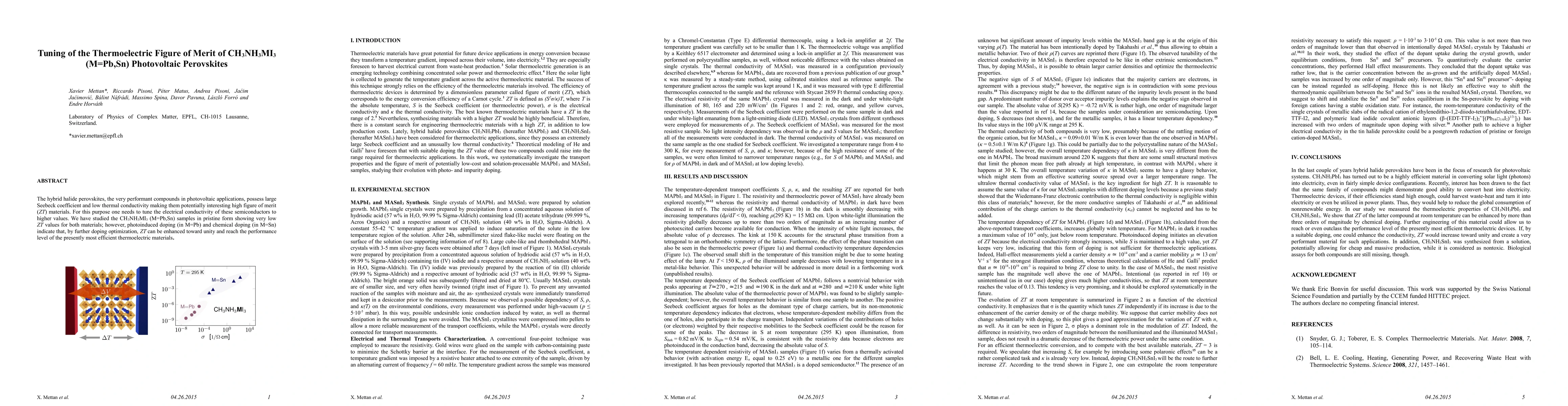 The hybrid halide perovskites, the very performant compounds in photovoltaic applications, possess large Seebeck coefficient and low thermal conductivity making them potentially interesting high figure of merit ($ZT$) materials. For this purpose one needs to tune the electrical conductivity of these semiconductors to higher values. We have studied the CH$_3$NH$_3$MI$_3$ (M=Pb,Sn) samples in pristine form showing very low $ZT$ values for both materials; however, photoinduced doping (in M=Pb) and chemical doping (in M=Sn) indicate that, by further doping optimization, $ZT$ can be enhanced toward unity and reach the performance level of the presently most efficient thermoelectric materials.