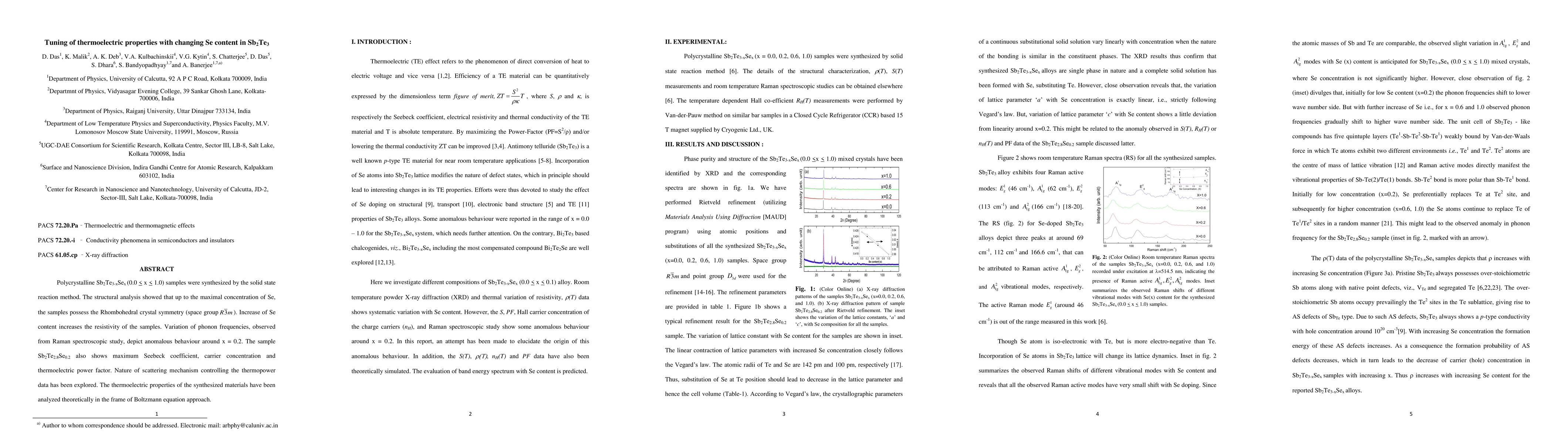 Polycrystalline Sb 2 Te 3-x Se x (0.0 < x < 1.0) samples were synthesized by the solid state reaction method. The structural analysis showed that up to the maximal concentration of Se, the samples possess the Rhombohedral crystal symmetry (space group R 3 m ). Increase of Se content increases the resistivity of the samples. Variation of phonon frequencies, observed from Raman spectroscopic study, depict anomalous behaviour around x = 0.2. The sample Sb 2 Te 2.8 Se 0.2 also shows maximum Seebeck coefficient, carrier concentration and thermoelectric power factor. Nature of scattering mechanism controlling the thermopower data has been explored. The thermoelectric properties of the synthesized materials have been analyzed theoretically in the frame of Boltzmann equation approach.