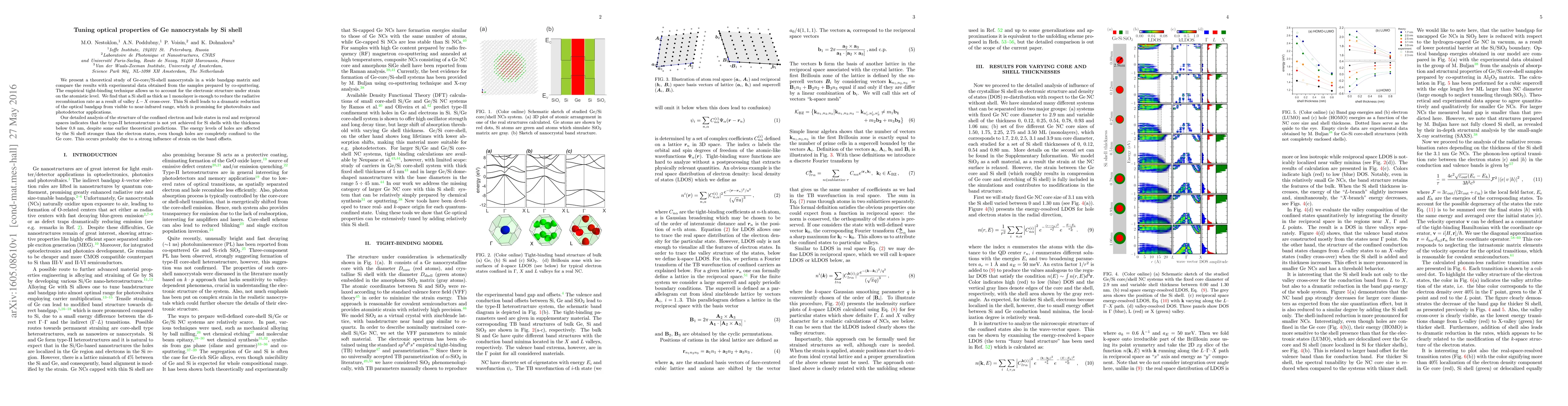 We present a theoretical study of Ge-core/Si-shell nanocrystals in a wide bandgap matrix and compare the results with experimental data obtained from the samples prepared by co-sputtering. The empirical tight-binding technique allows us to account for the electronic structure under strain on the atomistic level. We find that a Si shell as thick as 1 monolayer is enough to reduce the radiative recombination rate as a result of valley $L - X$ cross-over. Thin Si shell leads to a dramatic reduction of the optical bandgap from visible to near-infrared range, which is promising for photovoltaics and photodetector applications. Our detailed analysis of the structure of the confined electron and hole states in real and reciprocal spaces indicates that the type-II heterostructure is not yet achieved for Si shells with the thickness below 0.8 nm, despite some earlier theoretical predictions. The energy levels of holes are affected by the Si shell stronger than the electron states, even though holes are completely confined to the Ge core. This occurs probably due to a strong influence of strain on the band offsets.
