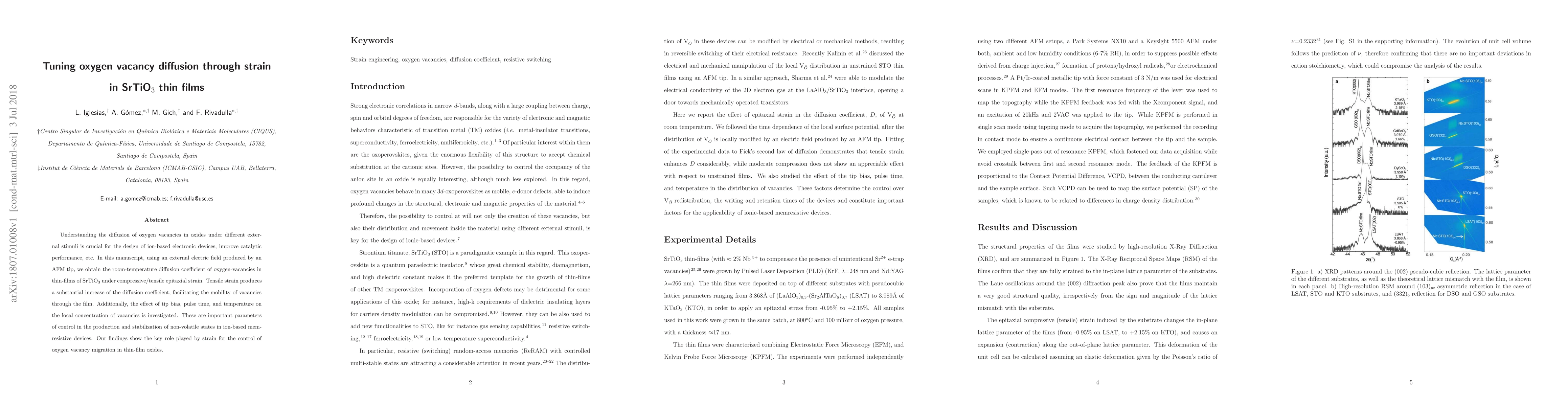 This research investigates the impact of epitaxial strain on the diffusion of oxygen vacancies in SrTiO$_3$ thin films using an electric field from an AFM tip. Tensile strain significantly enhances vacancy mobility, while various external parameters affect local vacancy concentration, crucial for ion-based electronic devices.