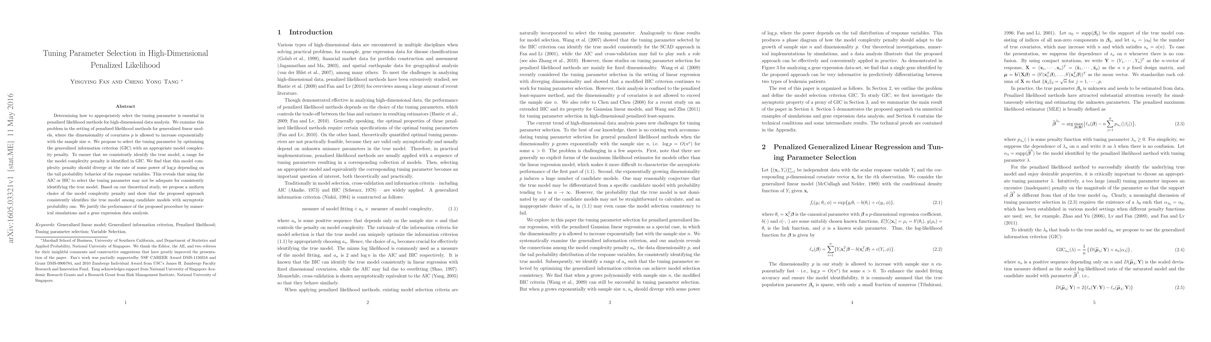 Determining how to appropriately select the tuning parameter is essential in penalized likelihood methods for high-dimensional data analysis. We examine this problem in the setting of penalized likelihood methods for generalized linear models, where the dimensionality of covariates p is allowed to increase exponentially with the sample size n. We propose to select the tuning parameter by optimizing the generalized information criterion (GIC) with an appropriate model complexity penalty. To ensure that we consistently identify the true model, a range for the model complexity penalty is identified in GIC. We find that this model complexity penalty should diverge at the rate of some power of $\log p$ depending on the tail probability behavior of the response variables. This reveals that using the AIC or BIC to select the tuning parameter may not be adequate for consistently identifying the true model. Based on our theoretical study, we propose a uniform choice of the model complexity penalty and show that the proposed approach consistently identifies the true model among candidate models with asymptotic probability one. We justify the performance of the proposed procedure by numerical simulations and a gene expression data analysis.
