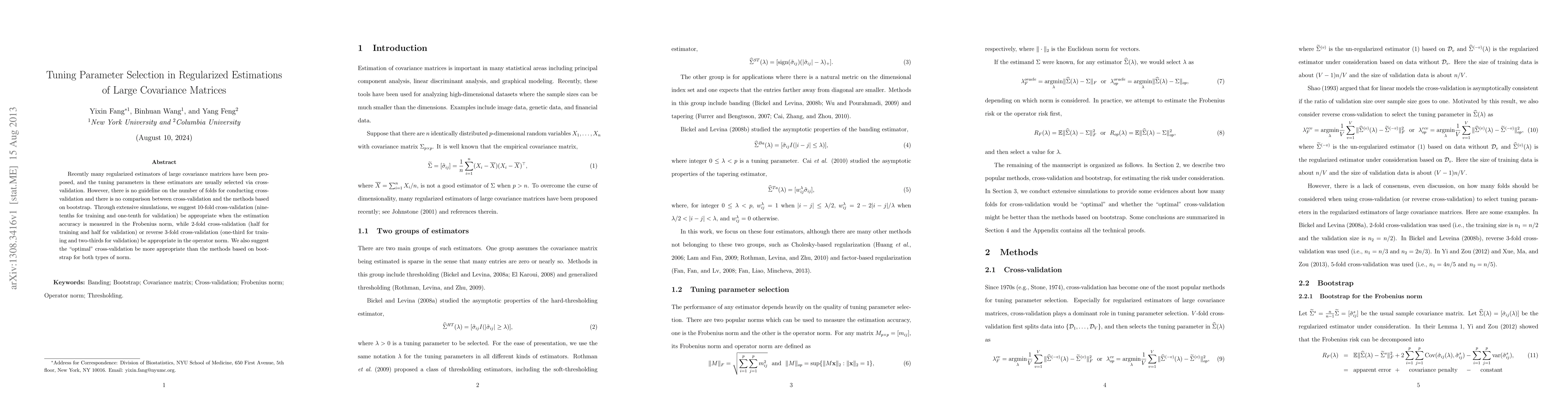 Recently many regularized estimators of large covariance matrices have been proposed, and the tuning parameters in these estimators are usually selected via cross-validation. However, there is no guideline on the number of folds for conducting cross-validation and there is no comparison between cross-validation and the methods based on bootstrap. Through extensive simulations, we suggest 10-fold cross-validation (nine-tenths for training and one-tenth for validation) be appropriate when the estimation accuracy is measured in the Frobenius norm, while 2-fold cross-validation (half for training and half for validation) or reverse 3-fold cross-validation (one-third for training and two-thirds for validation) be appropriate in the operator norm. We also suggest the "optimal" cross-validation be more appropriate than the methods based on bootstrap for both types of norm.