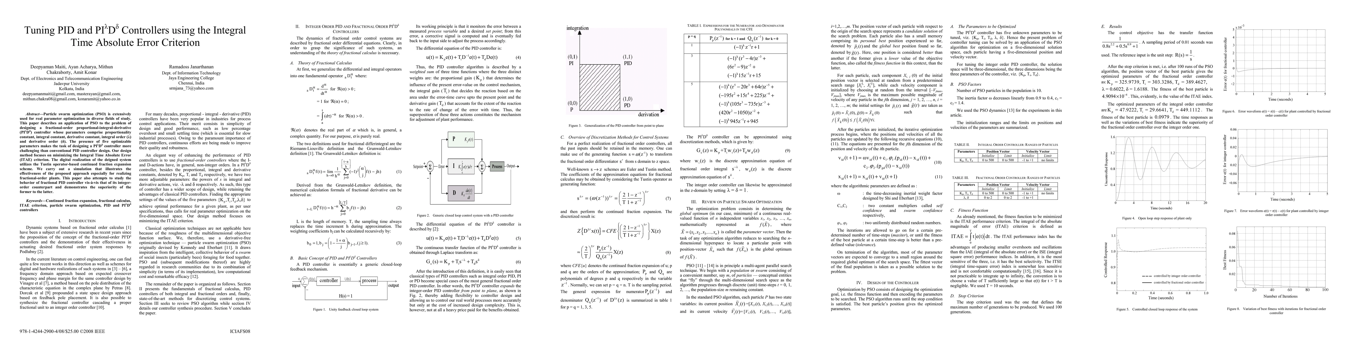 Particle swarm optimization (PSO) is extensively used for real parameter optimization in diverse fields of study. This paper describes an application of PSO to the problem of designing a fractional-order proportional-integral-derivative (FOPID) controller whose parameters comprise proportionality constant, integral constant, derivative constant, integral order (lambda) and derivative order (delta). The presence of five optimizable parameters makes the task of designing a FOPID controller more challenging than conventional PID controller design. Our design method focuses on minimizing the Integral Time Absolute Error (ITAE) criterion. The digital realization of the deigned system utilizes the Tustin operator-based continued fraction expansion scheme. We carry out a simulation that illustrates the effectiveness of the proposed approach especially for realizing fractional-order plants. This paper also attempts to study the behavior of fractional PID controller vis-a-vis that of its integer order counterpart and demonstrates the superiority of the former to the latter.