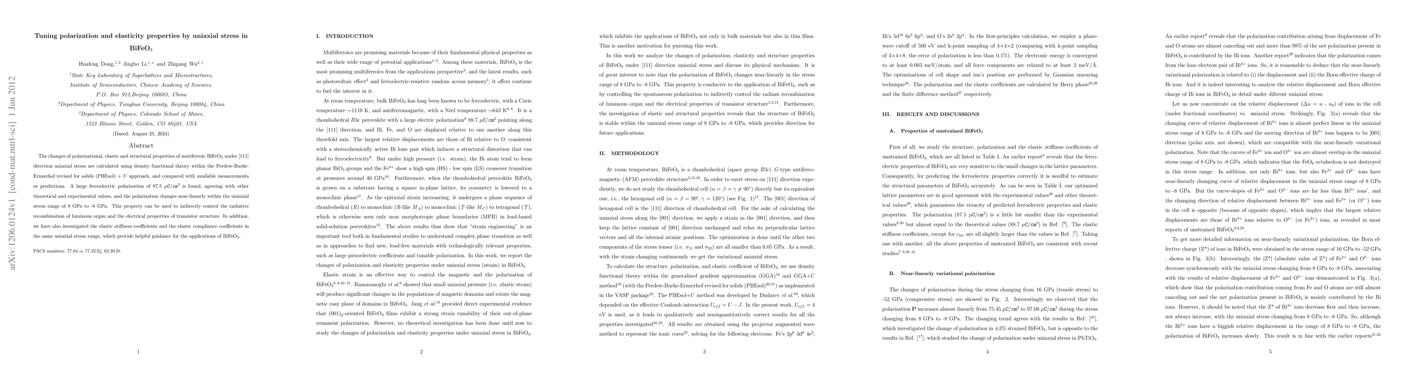 This study investigates the polarization and elasticity properties of BiFeO3 under uniaxial stress along the [111] direction using DFT calculations. The results show a large ferroelectric polarization of 87.5 μC/cm² and a near-linear polarization change under stress, which can be leveraged for controlling radiative recombination and transistor electrical properties.