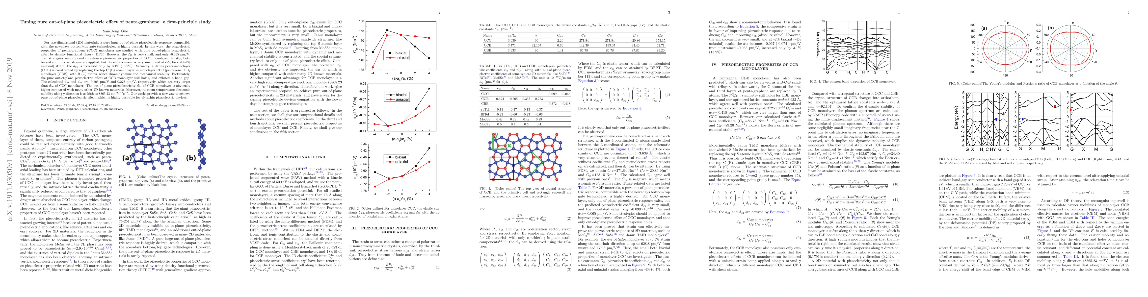 This study investigates the piezoelectric properties of penta-graphene using density functional theory, finding a small out-of-plane piezoelectric coefficient. Two strategies to enhance these properties are proposed: strain application and constructing a Janus penta-monolayer, which significantly improves the piezoelectric effect and electronic mobility.