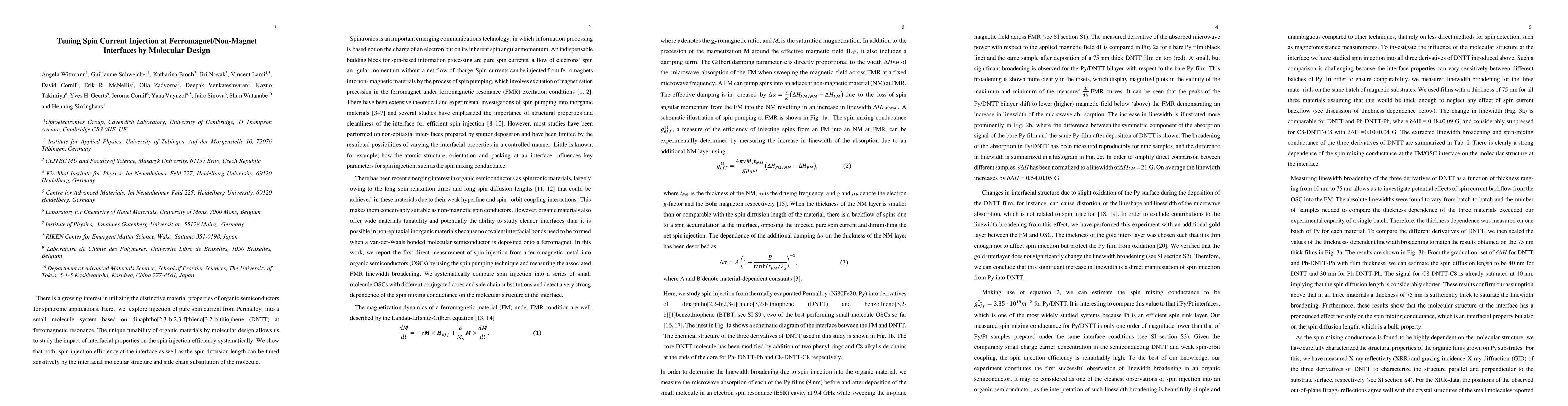 This paper investigates the injection of pure spin current from Permalloy into a DNTT organic semiconductor system, demonstrating that molecular design can tune spin injection efficiency and spin diffusion length at ferromagnet/non-magnet interfaces. The study highlights the potential of organic materials for spintronic applications through systematic interfacial property manipulation.