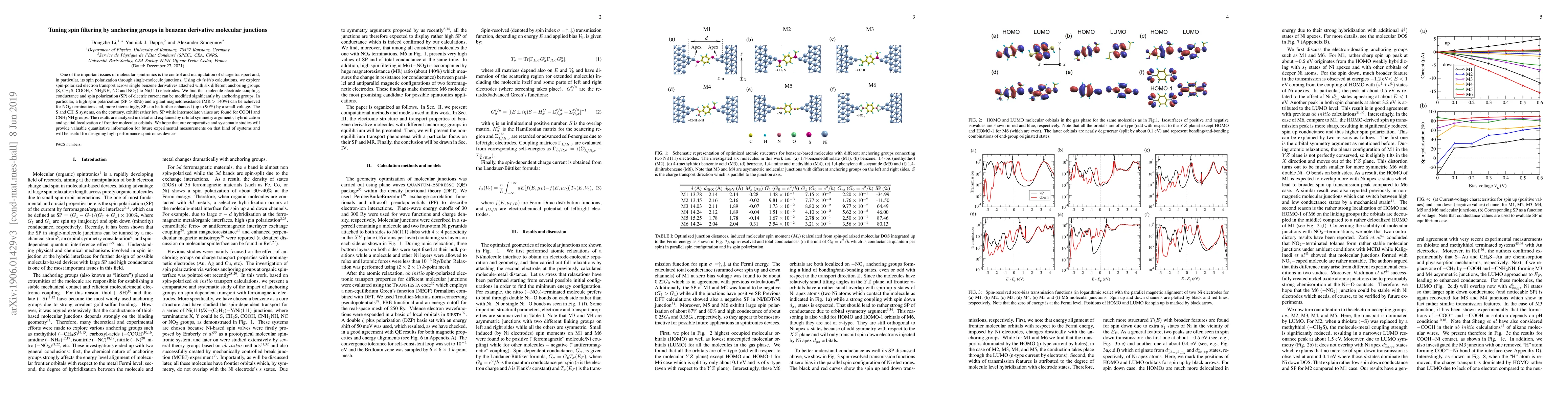 This study investigates the impact of different anchoring groups on spin-polarized electron transport in benzene derivatives within molecular junctions using $ab$ initio calculations. The research finds that NO$_2$ terminations achieve high spin polarization (>80%) and giant magnetoresistance (>140%), while S and CH$_3$S systems show low spin polarization. The findings are explained through orbital symmetry, hybridization, and spatial localization of frontier molecular orbitals, providing valuable insights for future spintronics device design.