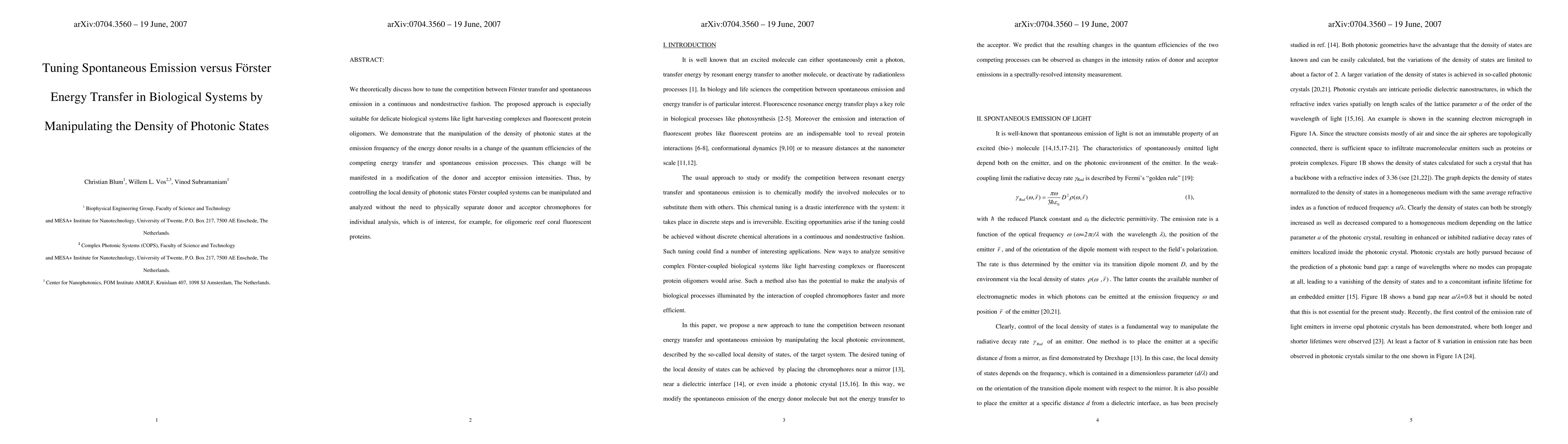 This paper proposes a theoretical method to tune the balance between Forster energy transfer and spontaneous emission in biological systems by adjusting the density of photonic states. The approach allows for nondestructive manipulation of quantum efficiencies, facilitating analysis of systems like light-harvesting complexes without physically separating donor and acceptor chromophores.