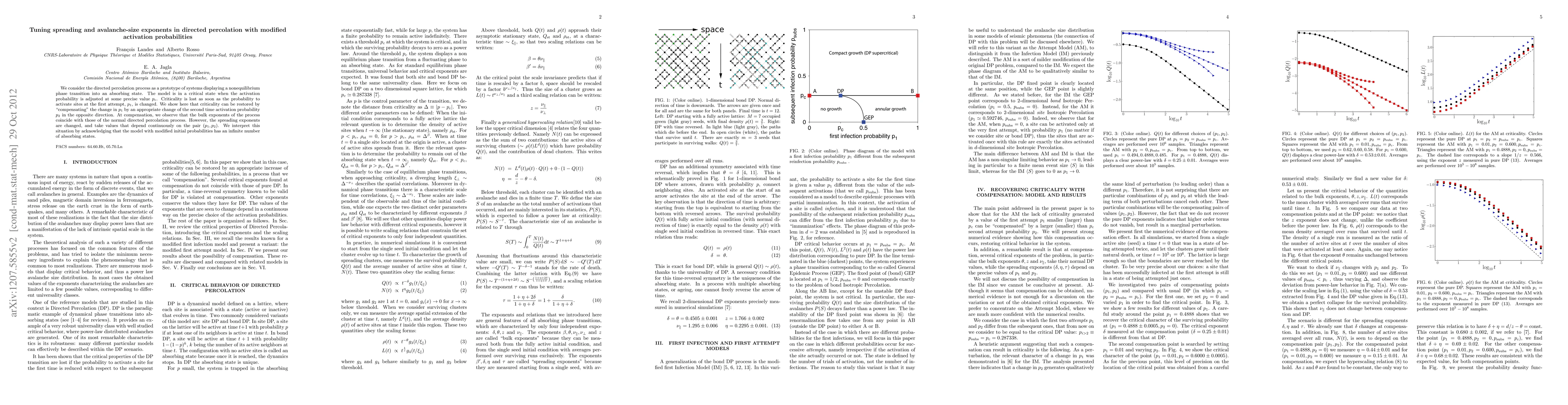 This paper explores how modifying activation probabilities in directed percolation can restore criticality and affect spreading and avalanche-size exponents. It finds that adjusting the second activation probability compensates for changes in the initial activation probability, resulting in altered spreading exponents while maintaining the bulk exponents.