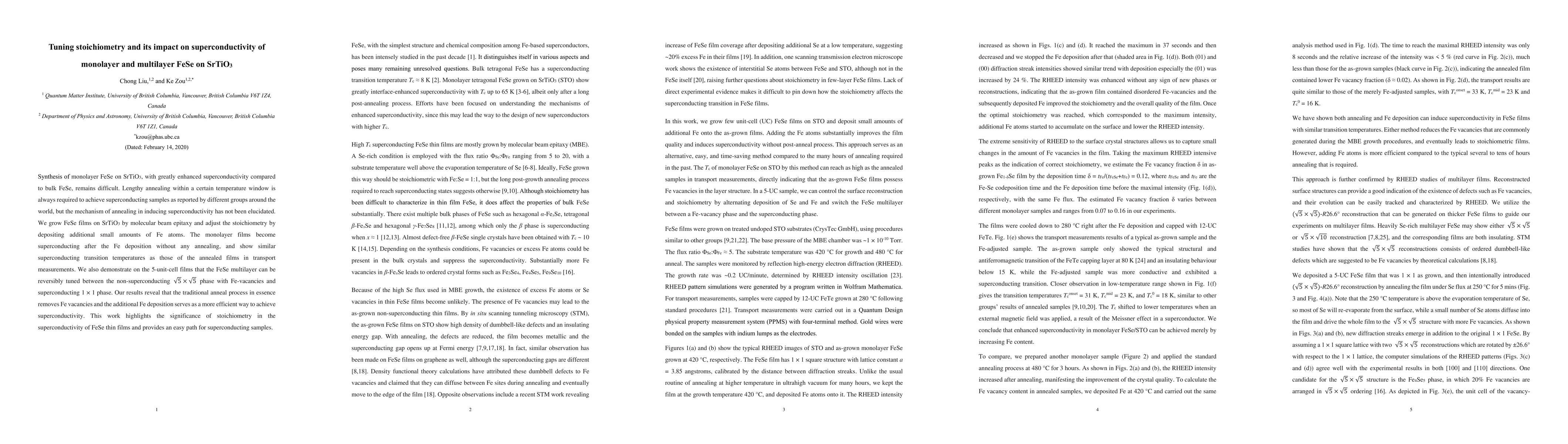 This study demonstrates that adjusting the stoichiometry of FeSe films on SrTiO3 through additional Fe deposition can induce superconductivity without lengthy annealing, highlighting the importance of stoichiometry in achieving superconductivity in FeSe thin films. The research also shows that multilayer FeSe can be tuned between non-superconducting and superconducting phases.