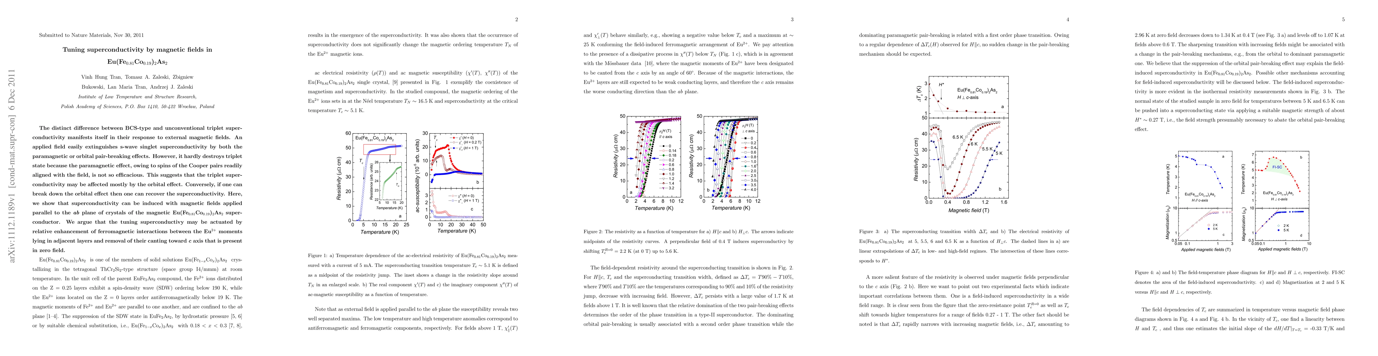 The distinct difference between BCS-type and unconventional triplet superconductivity manifests itself in their response to external magnetic fields. An applied field easily extinguishes s-wave singlet superconductivity by both the paramagnetic or orbital pair-breaking effects. However, it hardly destroys triplet state because the paramagnetic effect, owing to spins of the Cooper pairs readily aligned with the field, is not so efficacious. This suggests that the triplet superconductivity may be affected mostly by the orbital effect. Conversely, if one can break down the orbital effect then one can recover the superconductivity. Here, we show that superconductivity can be induced with magnetic fields applied parallel to the ab plane of crystals of the magnetic Eu(Fe0.81Co0.19)2As2 superconductor. We argue that the tuning superconductivy may be actuated by relative enhancement of ferromagnetic interactions between the Eu2+ moments lying in adjacent layers and removal of their canting toward c axis that is present in zero field.