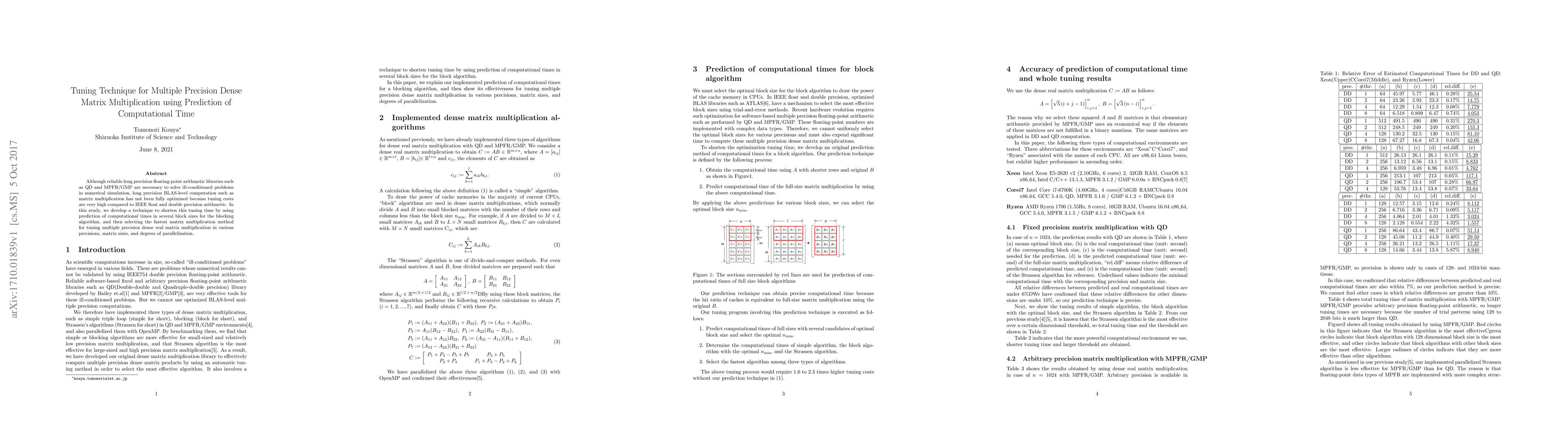 This study introduces a technique for optimizing multiple precision dense matrix multiplication by predicting computational times for different block sizes, aiming to reduce the high tuning costs associated with long precision arithmetic. The method selects the fastest matrix multiplication method based on these predictions across various precisions, sizes, and parallelization levels.