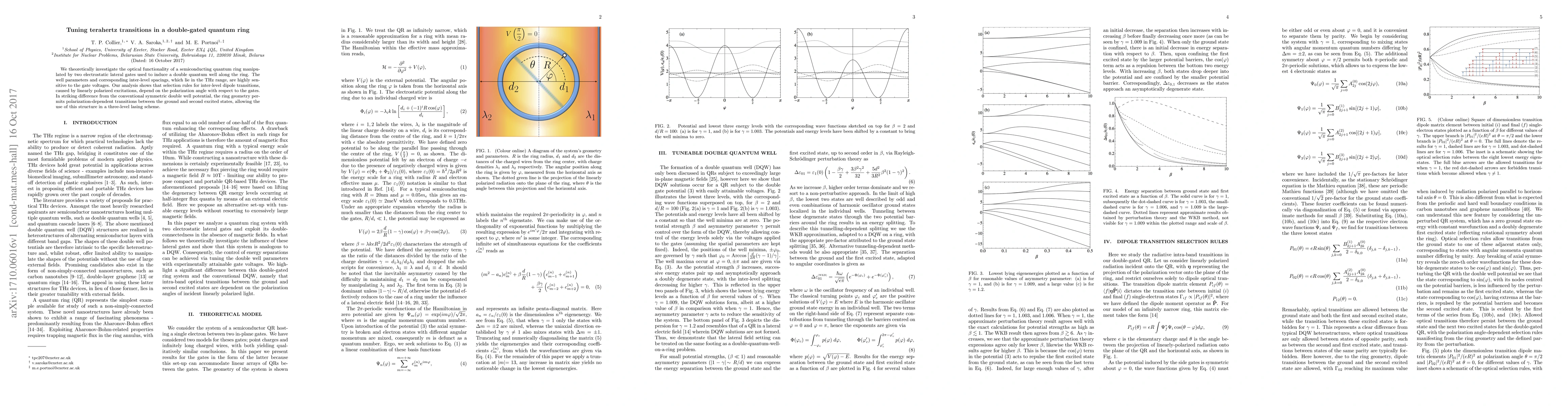 We theoretically investigate the optical functionality of a semiconducting quantum ring manipulated by two electrostatic lateral gates used to induce a double quantum well along the ring. The well parameters and corresponding inter-level spacings, which lie in the THz range, are highly sensitive to the gate voltages. Our analysis shows that selection rules for inter-level dipole transitions, caused by linearly polarized excitations, depend on the polarization angle with respect to the gates. In striking difference from the conventional symmetric double well potential, the ring geometry permits polarization-dependent transitions between the ground and second excited states, allowing the use of this structure in a three-level lasing scheme.