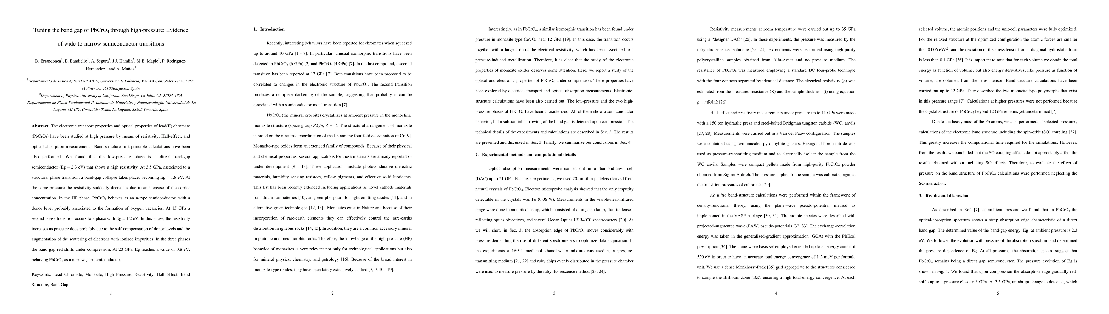 The electronic transport properties and optical properties of lead(II) chromate (PbCrO4) have been studied at high pressure by means of resistivity, Hall-effect, and optical-absorption measurements. Band-structure first-principle calculations have been also performed. We found that the low-pressure phase is a direct band-gap semiconductor (Eg = 2.3 eV) that shows a high resistivity. At 3.5 GPa, associated to a structural phase transition, a band-gap collapse takes place, becoming Eg = 1.8 eV. At the same pressure the resistivity suddenly decreases due to an increase of the carrier concentration. In the HP phase, PbCrO4 behaves as an n-type semiconductor, with a donor level probably associated to the formation of oxygen vacancies. At 15 GPa a second phase transition occurs to a phase with Eg = 1.2 eV. In this phase, the resistivity increases as pressure does probably due to the self-compensation of donor levels and the augmentation of the scattering of electrons with ionized impurities. In the three phases the band gap red shifts under compression. At 20 GPa, Eg reaches a value of 0.8 eV, behaving PbCrO4 as a narrow-gap semiconductor.
