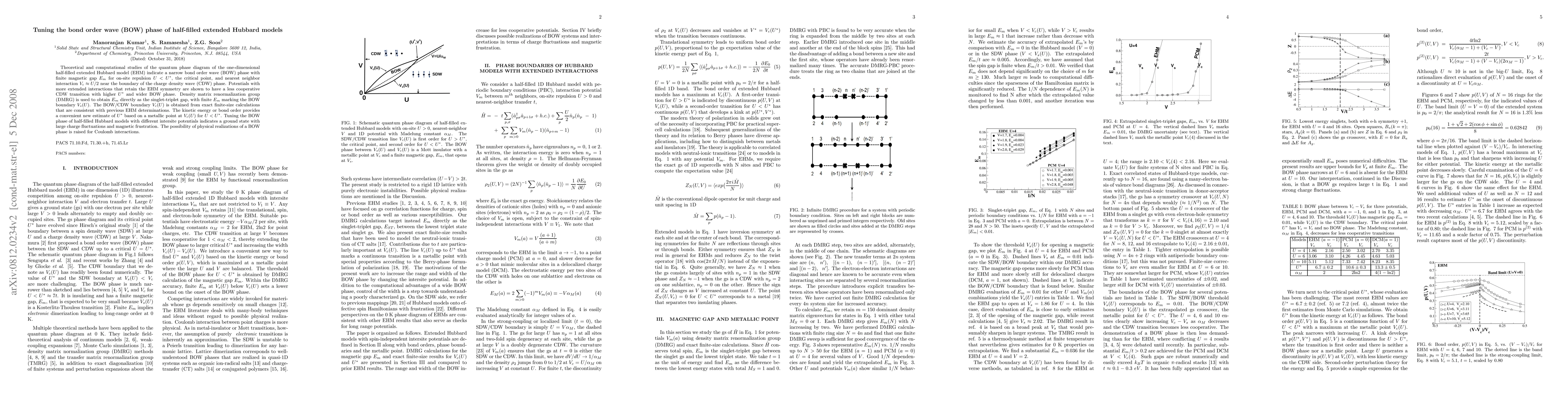 Theoretical and computational studies of the quantum phase diagram of the one-dimensional half-filled extended Hubbard model (EHM) indicate a narrow bond order wave (BOW) phase with finite magnetic gap $E_m$ for on-site repulsion $U < U^*$, the critical point, and nearest neighbor interaction $V_c \approx U/2$ near the boundary of the charge density wave (CDW) phase. Potentials with more extended interactions that retain the EHM symmetry are shown to have a less cooperative CDW transition with higher $U^*$ and wider BOW phase. Density matrix renormalization group (DMRG) is used to obtain $E_m$ directly as the singlet-triplet gap, with finite $E_m$ marking the BOW boundary $V_s(U)$. The BOW/CDW boundary $V_c(U)$ is obtained from exact finite-size calculations that are consistent with previous EHM determinations. The kinetic energy or bond order provides a convenient new estimate of $U^*$ based on a metallic point at $V_c(U)$ for $U < U^*$. Tuning the BOW phase of half-filled Hubbard models with different intersite potentials indicates a ground state with large charge fluctuations and magnetic frustration. The possibility of physical realizations of a BOW phase is raised for Coulomb interactions.