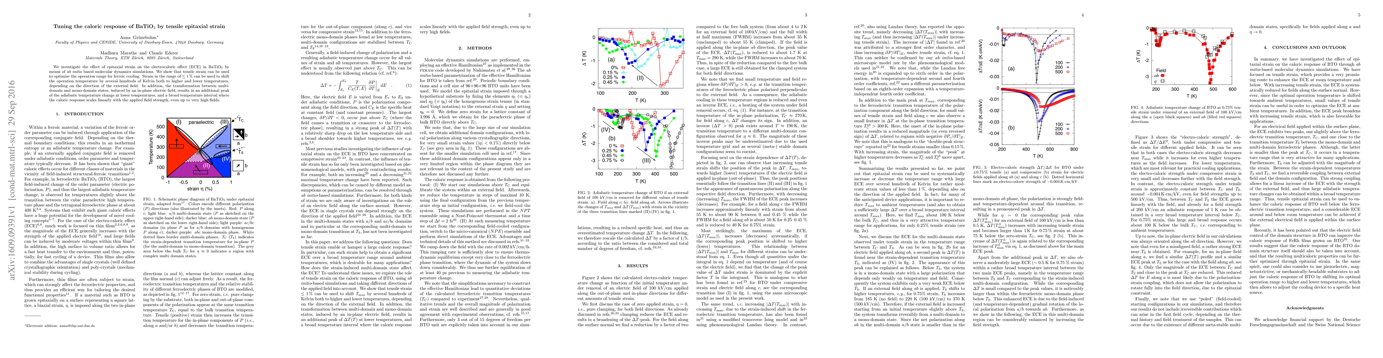 We investigate the effect of epitaxial strain on the electrocaloric effect (ECE) in BaTiO$_3$ by means of ab initio based molecular dynamics simulations. We show that tensile strain can be used to optimize the operation range for ferroic cooling. Strain in the range of $\leq 1$ % can be used to shift the operation temperature by several hundreds of Kelvin both to higher and lower temperatures, depending on the direction of the external field. In addition, the transformation between multi-domain and mono-domain states, induced by an in-plane electric field, results in an additional peak of the adiabatic temperature change at lower temperatures, and a broad temperature interval where the caloric response scales linearly with the applied field strength, even up to very high fields.