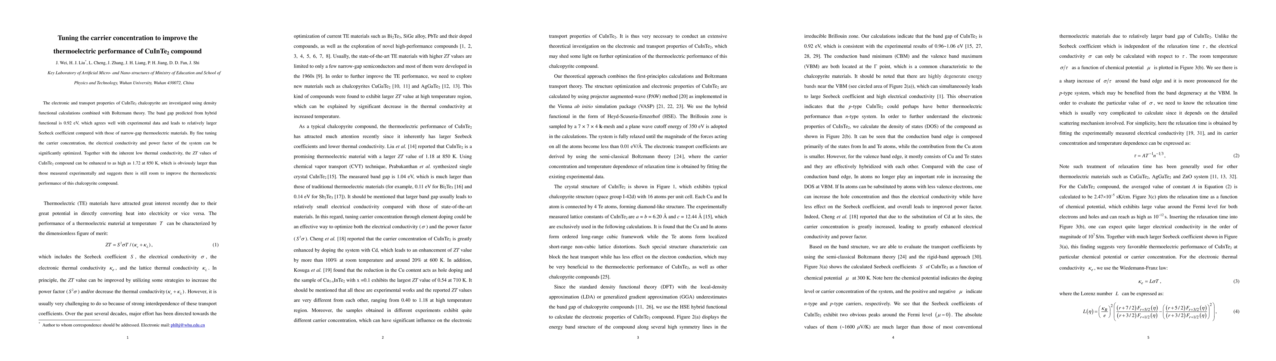 This study investigates the thermoelectric properties of CuInTe2 using density functional calculations and Boltzmann theory, finding that optimizing carrier concentration can significantly enhance electrical conductivity and power factor. The theoretical ZT value of 1.72 at 850 K suggests potential for further improvements in thermoelectric performance.