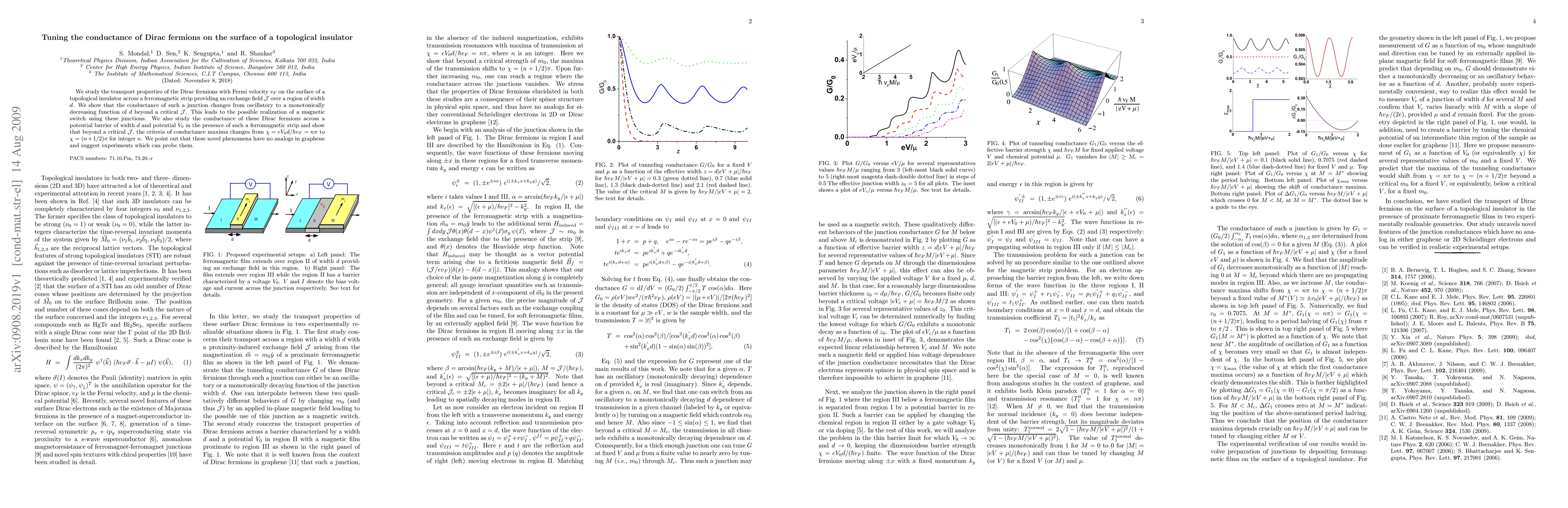 We study the transport properties of the Dirac fermions with Fermi velocity $v_F$ on the surface of a topological insulator across a ferromagnetic strip providing an exchange field ${\mathcal J}$ over a region of width $d$. We show that the conductance of such a junction changes from oscillatory to a monotonically decreasing function of $d$ beyond a critical ${\mathcal J}$. This leads to the possible realization of a magnetic switch using these junctions. We also study the conductance of these Dirac fermions across a potential barrier of width $d$ and potential $V_0$ in the presence of such a ferromagnetic strip and show that beyond a critical ${\mathcal J}$, the criteria of conductance maxima changes from $\chi= e V_0 d/\hbar v_F = n \pi$ to $\chi= (n+1/2)\pi$ for integer $n$. We point out that these novel phenomena have no analogs in graphene and suggest experiments which can probe them.